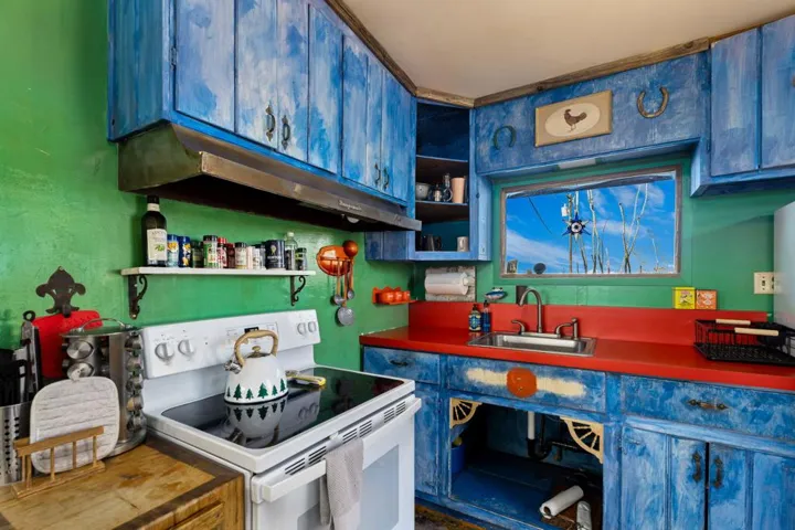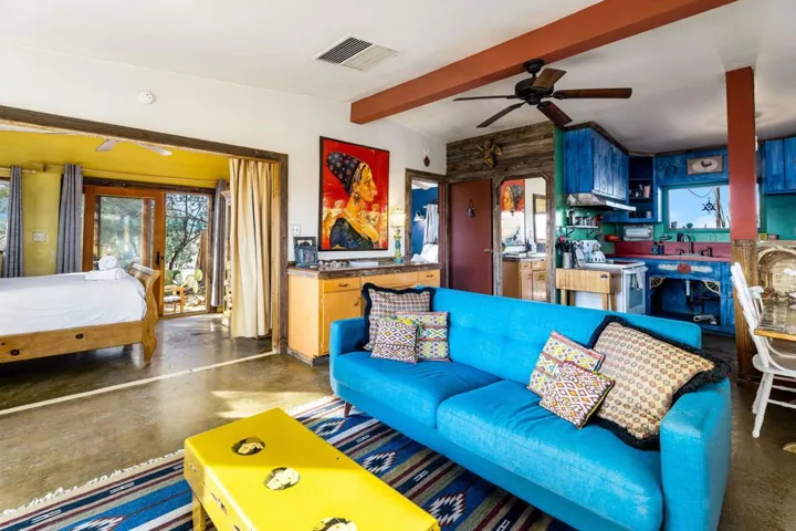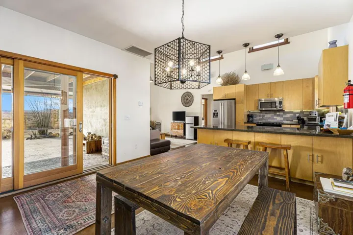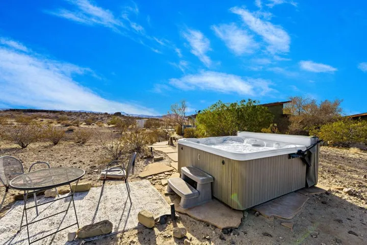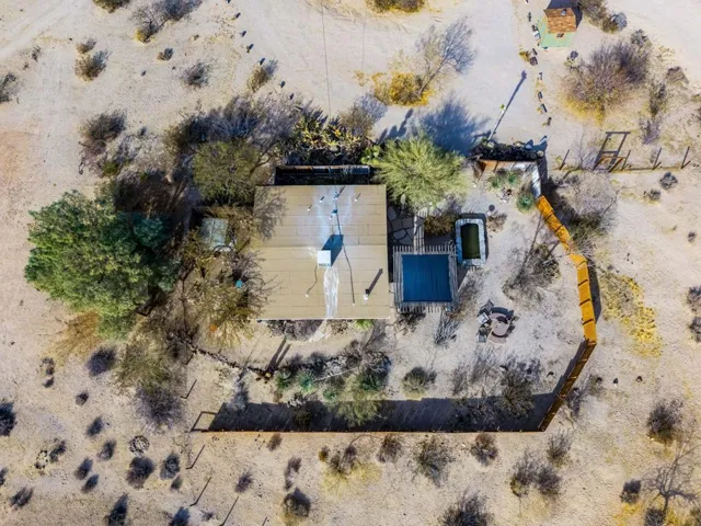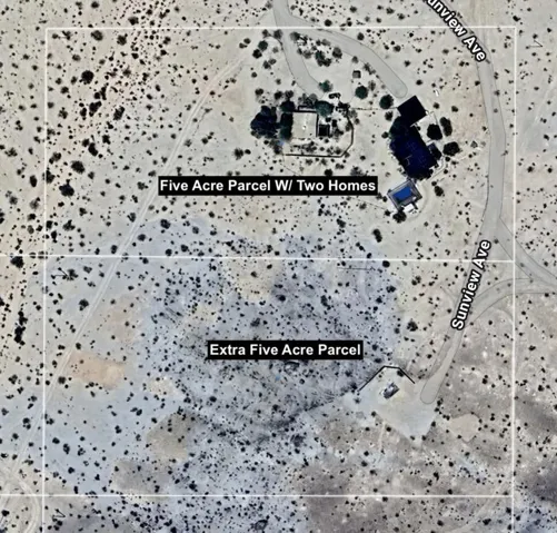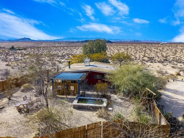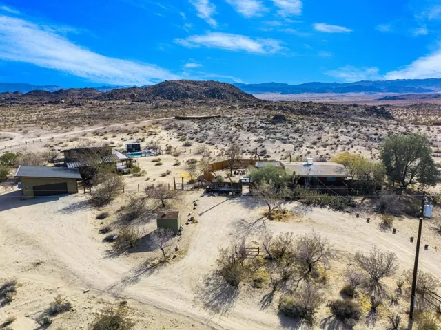 This established Airbnb retreat in Coyote Valley offers two unique homes on 10 acres, each with stunning desert views, a private in-ground pool w/ gazebo, multiple spas, owned solar, fire pits, and a strong rental history. Most of the surrounding land is untouched BLM and Conservancy land of nearly 1,000 acres minus the adjacent famous Mojave Rock Ranch.The first home, a 1965 vintage retreat, features two bedrooms, one bath, reflection glass portals, a fire pit, and an above-ground spa, surrounded by Joshua Trees and a serene reflection pool. Guests love its artistic flair and privacy.The second home, a modern architectural abode, boasts soaring ceilings, a spacious open kitchen, and a wraparound porch with breathtaking views. It includes two bedrooms (one en suite) and a half bath, plus a private spa overlooking the desert. An oversized roll down glass door helps bring the outside in. Between the homes, enjoy a private in-ground pool and lounging area. Additionally there is finished garage space with office allowing for flexibility – The 10-acre lot (two 5-acre parcels) offers seclusion yet is minutes from 29 Palms and Joshua Tree Village, with easy access to boulders and the Transmission sculpture by Daniel Popper.A proven Airbnb favorite, this property comes with rental history, guest reviews, and the Airbnb portal for a seamless transition. Don’t miss this rare opportunity with a second lot for expansion – create your dream family compound. Schedule a private viewing today! Sale includes two parcels APN: 0632-091-05 and 0632-091-06.