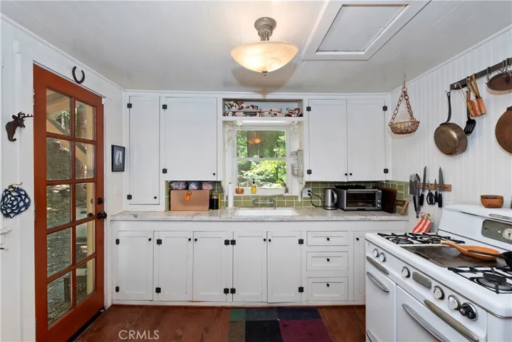 We call it Creek Side Cottage because you cross over the stream, on a bridge and it’s right there. This Vintage cottage with original latch windows, wood floors vaulted open beamed ceiling and a real granite fireplace is currently being used as a writer’s retreat, in that it is quiet and secluded. It’s located in the highly coveted, gated community of Dogwood Blue Jay cyn, just minutes from the town of Blue Jay. The area is rare with a HOA that has its own wells and water system. 160 acres of green belt meanders around each property, providing a private forest feeling. _____________________________________________________________________________________