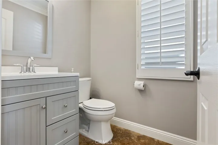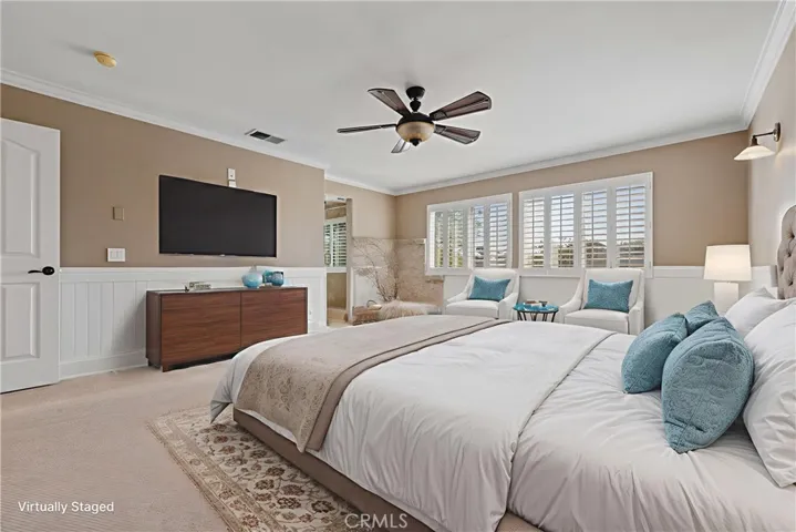 Interior features include wood shutters, crown molding throughout, and Travertine flooring in the downstairs living areas. The kitchen is equipped with double ovens, a touch-activated faucet, and ample workspace.