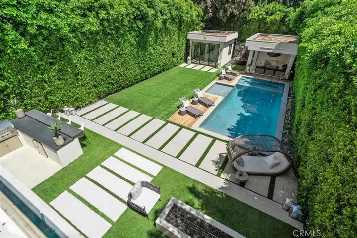 Recently refreshed, this Sherman Oaks home seamlessly blends sleek design with inviting warmth. Inside, you’ll notice the details—wide-plank white-oak floors with natural texture, porcelain-wrapped fireplaces, dual kitchen islands, and intuitive home technology for effortless living. Glass pocket doors open to a private backyard retreat with a heated zero-edge pool, spa, cabana lounge, a bonus room ideal for a gym, studio, or creative space, and a sleek firepit—perfect for golden hour gatherings. Upstairs, the primary suite offers a private terrace, boutique-style closet, and a spa-inspired bath wrapped in large-format porcelain tile. Each of the five additional ensuite bedrooms provides comfort and privacy. A custom-tiered home theater, integrated automation, and an EV-ready garage complete this beautifully turnkey modern. Privately nestled in a quiet enclave just minutes from Ventura Blvd and the heart of Sherman Oaks, this home blends timeless design with the ease of modern living—where every detail feels just right.