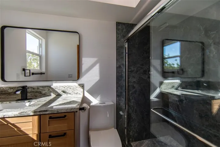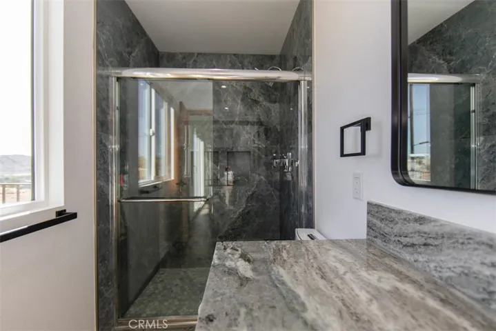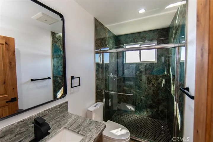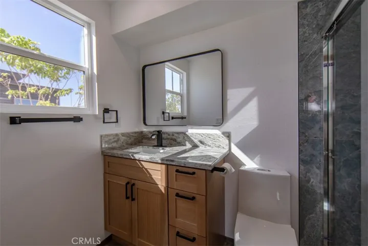 Luxury continues throughout with granite countertops in all bathrooms, ceramic tile showers with waterfall showerheads, dual-flush toilets, and durable laminate flooring. The home is all-electric except for the gas stove and includes owned solar panels for long-term energy savings.