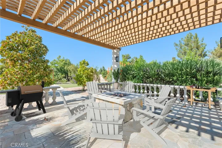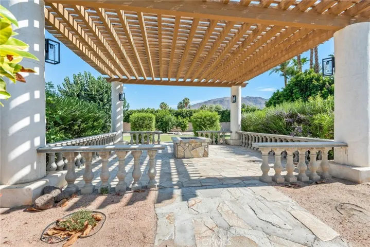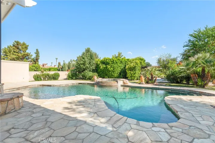 Enjoy resort-style outdoor living with a sparkling pool and spa, custom water features, an outdoor kitchen with porcelain and marble tile, built-in seating around a cozy firepit, a putting green, and multiple garden vignettes. The long private driveway accommodates RV, golf cart, or guest parking, plus a 2-car garage. Owned full-roof solar panels complete this turnkey, move-in ready home—just minutes from El Paseo shopping, top golf courses, fine dining, casinos and Eisenhower Medical Center.