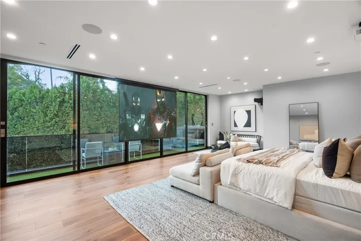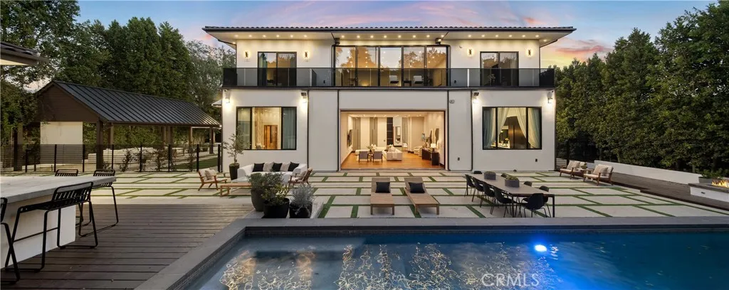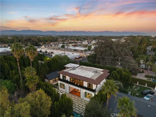 Tucked behind mature privacy hedges on an expansive nearly 18,000 sf lot, this gated, newer construction estate is ideally located south of the Boulevard in prime Tarzana. As you enter through the grand front door, you are greeted to a sprawling open floor plan highlighted by soaring ceilings that carry throughout the home. The sleek, modern chef’s kitchen is equipped with top-of-the-line Miele appliances, a walk-in pantry, massive waterfall island and sun-drenched breakfast nook. An oversized sliding glass door in the spacious family room disappears into the wall, allowing for a seamless flow between the indoor and outdoor living spaces. Completing the main level is a formal living and dining room designed for entertaining, ensuite bedroom, laundry room and bonus room. Ascend the elegantly curved staircase or take a ride in your personal elevator to the upper level, where you will find a large recreation room with direct access to the backyard and four generously sized ensuite bedrooms, each with its own walk-in closet and private balcony. The expansive primary suite features a private sitting room, custom walk-in closet and luxe ensuite bathroom, complete with a soaking tub, rainfall shower and double vanity. A floor-to-ceiling wall of glass floods the primary bedroom with natural light and a projection screen allows you to watch tv from bed. Surrounded by mature privacy hedges, the entertainer’s backyard is a true oasis highlighted by a 50 ft heated pool/spa with a baja shelf and pool house that offers a kitchenette and bathroom. There’s also a large cabana, outdoor kitchen with bar seating, built-in firepit, sports court and ample patio/yard space. Additional amenities include a smart home system with integrated speakers, robust security system, electric pool cover and three-car garage with oversized doors, a car lift and EV charger. Located down the street from Ventura Boulevard, enjoy easy access to excellent shopping, dining and entertainment options.