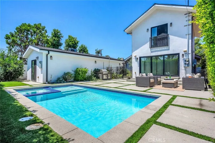 Glass sliders open to a private backyard retreat with a built-in BBQ, sparkling pool and spa, and a fully equipped 2-bedroom, 1-bath guest house with its own kitchen, laundry, and separate address (5108 Greenbush Ave). Ideal for extended family, a guest suite, or rental income.