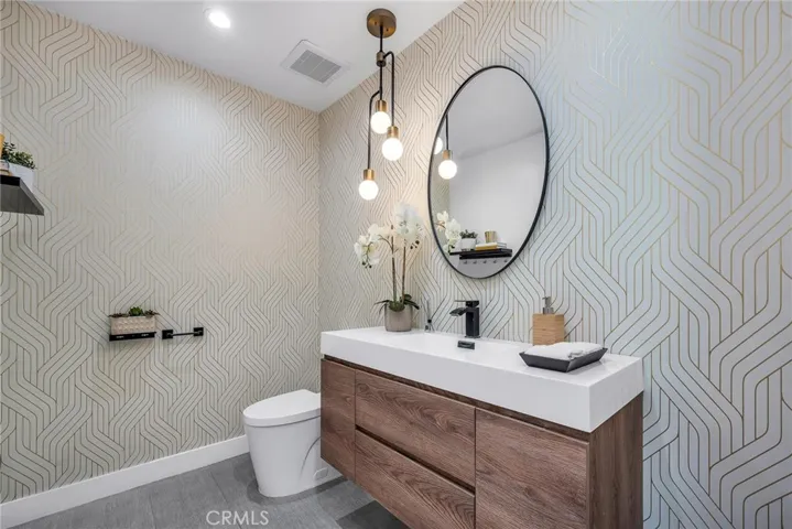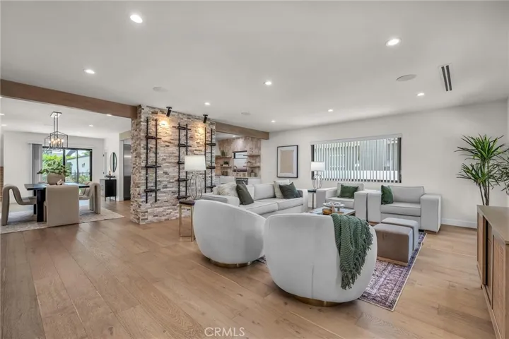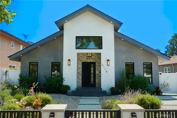 Welcome to this stylish and thoughtfully designed modern French farmhouse in the heart of Sherman Oaks. From the moment you arrive, the bold front entry—featuring a contemporary chandelier and stone accent wall—sets the tone for what’s inside.