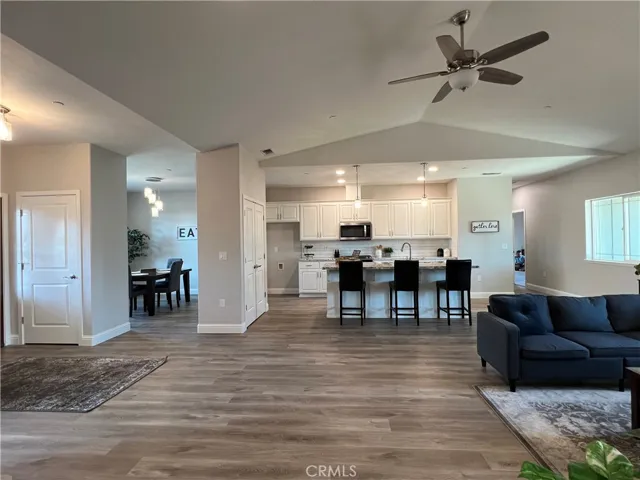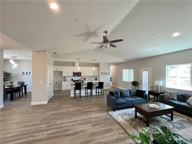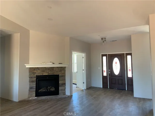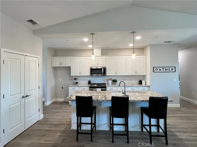 The open-concept floor plan centers around a spacious kitchen with quartz countertops, a large island with sink and eating space for several, a pantry, and abundant cabinet storage—perfect for any home chef. The adjoining living area includes a stacked stone gas fireplace, adding warmth and charm.