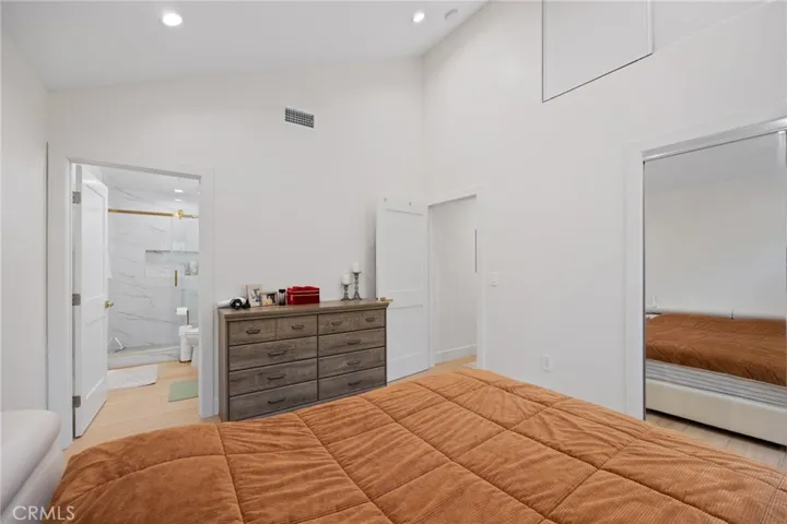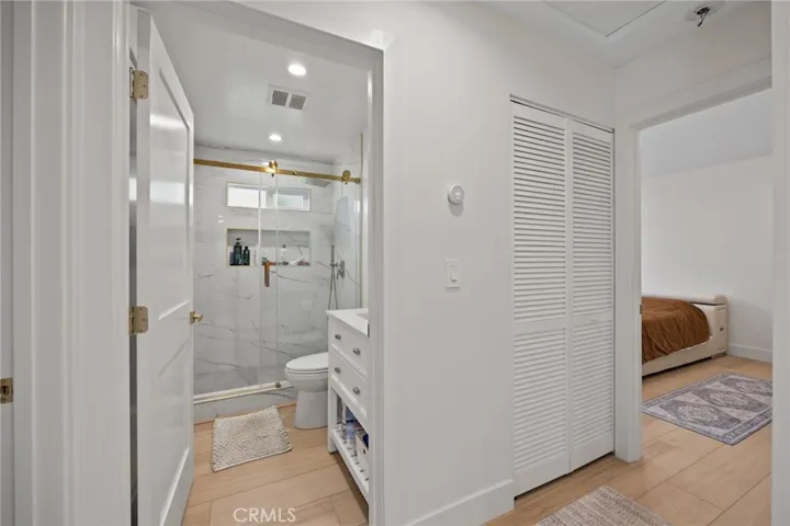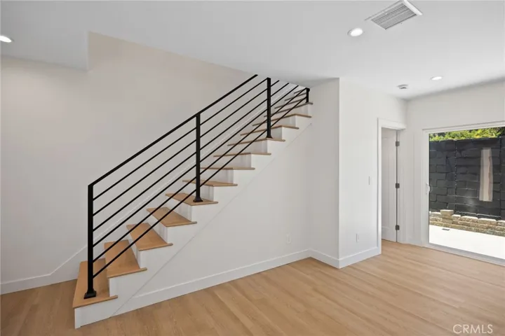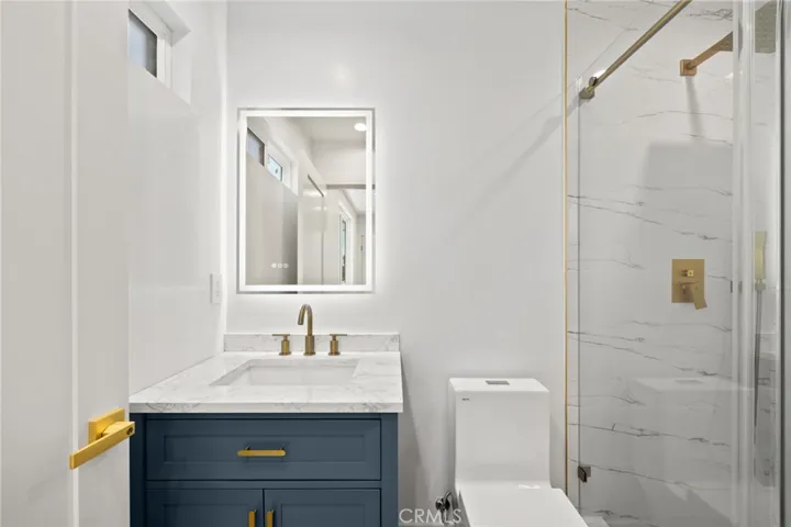 The two newly built ADUs in the rear each measure 1,078 square feet and have a townhouse-style layout. Upstairs, you’ll find two master bedrooms, each with its own full-sized bathroom featuring walk-in showers, LED-lit mirrors, modern one-piece toilets, and more gold accents. The first floor offers a guest half-bath and a professionally designed kitchen with an island that flows into the living area. Sliding doors lead out to a private backyard, perfect for outdoor enjoyment and added privacy.