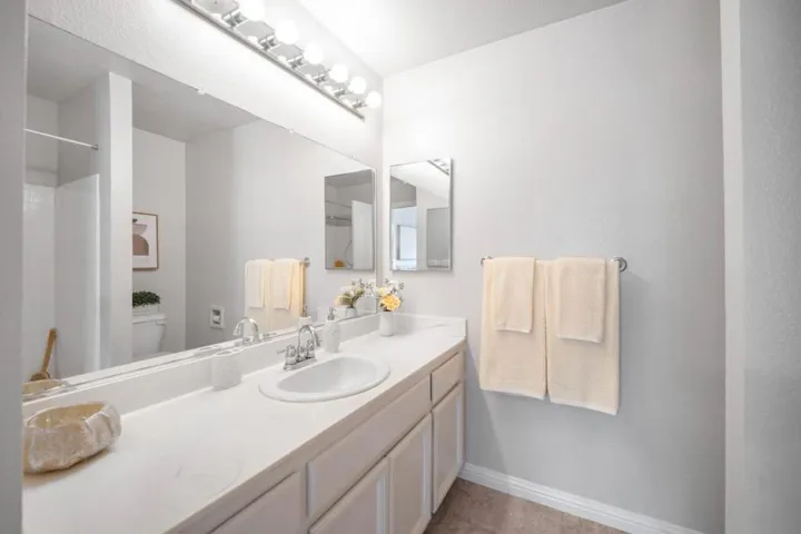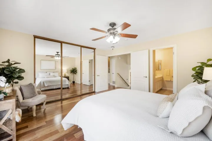 This is end-unit is a premium lot with views & privacy. The home features 2 bedrooms & 2 full bathrooms, offering a comfortable living space of 1,099 square feet. Few have this large patio overlooking the nature preserve and neighborhood. You’ll find it extends your living space & makes a great place to entertain. The kitchen is well-equipped with granite countertops, a dishwasher, garbage disposal, microwave, self-cleaning oven, & refrigerator, making it the heart of the home for culinary enthusiasts. Enjoy the open layout with a dining area in the living room, accentuated by the warm glow of a fireplace & the elegance of wood flooring throughout. The home also boasts central AC & heating, ensuring a pleasant environment year-round, & a vaulted ceiling that adds to the spacious feel. The large primary suite features a sliding glass door leading out to a private balcony. The primary bathroom features a tub and shower combo & an expansive counter. Laundry is conveniently located inside, equipped with a washer & dryer, streamlining household chores. This property has a private garage with space for one vehicle, plus an assigned parking space across from the home. This home is perfect for a cozy & manageable lifestyle in the heart of San Jose.