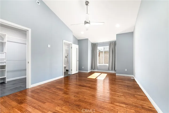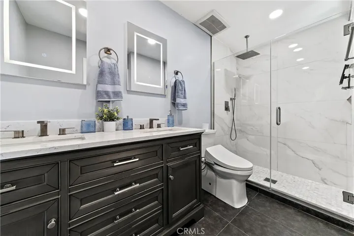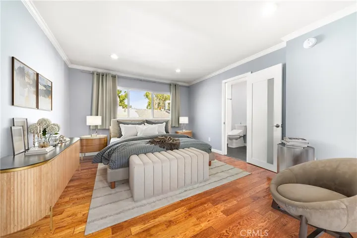 Step through the door to volumes of light, soaring ceilings, and gleaming hardwood floors. A romantic electric fireplace anchors the living room, perfectly paired with a chic bar for easy entertaining. The heart of the home—a refreshed kitchen—combines a practical island with stainless steel appliances and an intimate dining area that keeps cooking and conversation connected. Upstairs, discover two generously sized primary suites, each with a fully renovated bathroom featuring modern fixtures; one suite adds the luxury of heated tile floors for crisp L.A. mornings. A convenient, updated powder room serves the lower level, and an in-unit laundry nook streamlines daily living.