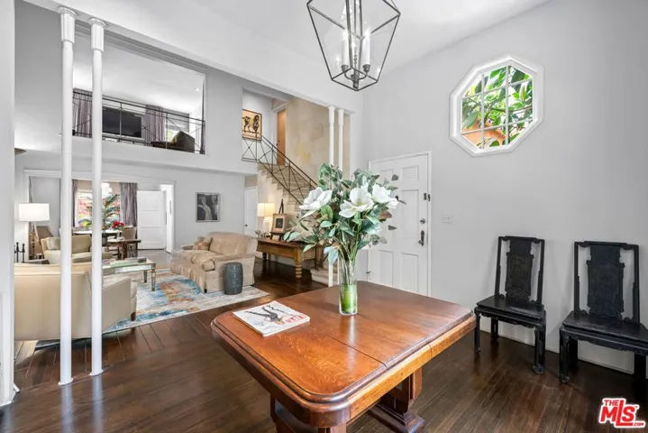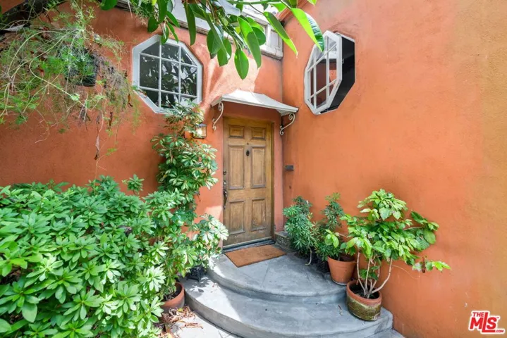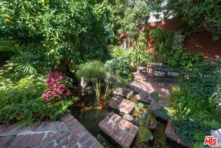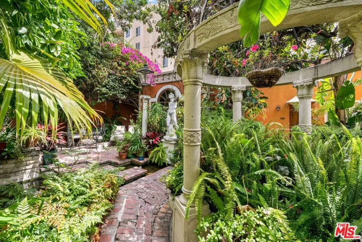 DRAMATIC AND SECLUDED 1930’S COURTYARD TUSCAN VILLA BEHIND GATES. THIS LAVISH OLD HOLLYWOOD 2 LEVEL VILLA, IS BEAUTIFULLY AND COMPLETELY FURNISHED ALL IN HIGHEST QUALITY WITH VINTAGE RUGS, SILK DRAPERIES, ANTIQUES, ORIGINAL ART, FINE LINENS. TALL ARCHED WINDOWS OFF GRACIOUS LIBRARY/ENTRY. GORGEOUS LIVING ROOM WITH 19 FOOT CEILINGS HAS A DECORATIVE FIREPLACE. FORMAL DINING ROOM. KITCHEN COMPLETELY EQUIPPED INCLUDING FINE CHINA, STERLING SILVER & BACCARAT CRYSTAL. GORGEOUS ORIGINAL STAIRCASE LEADS TO A LARGE PRIMARY SUITE WITH AMPLE CLOSETS & STORAGE. HUGE LOFT/MEDIA ROOM THAT CAN CONVERT TO A SECOND BEDROOM WITH PRIVATE BATH & CLOSET. 2-CAR PARKING NEXT TO BACK ENTRANCE. THE LUSH CENTRAL GARDEN, COMPLETE WITH FOUNTAIN, EXOTIC FLORA, TREES, KOI POND AND RESIDENT TURTLES, DEFY THE FACT THAT YOU ARE ONLY A FEW SHORT STEPS FROM SUNSET AND CRESCENT HEIGHTS. IT IS PRIVATE WITH NO COMMON WALLS, QUIET & SECURE.
