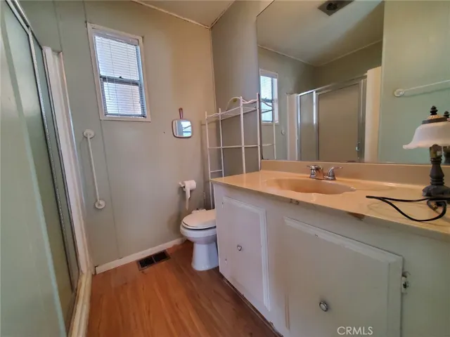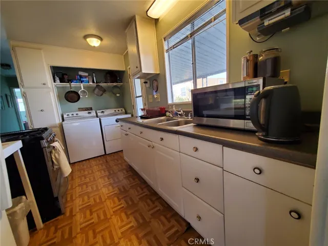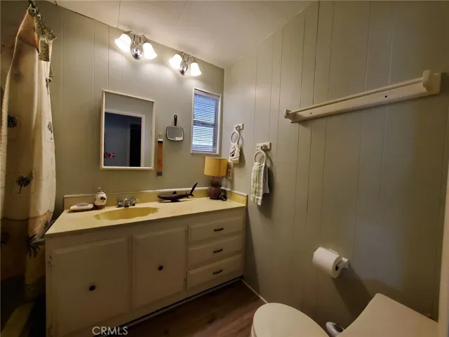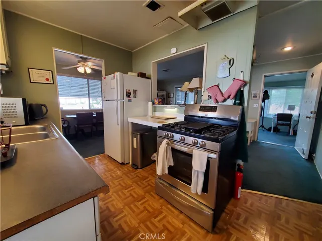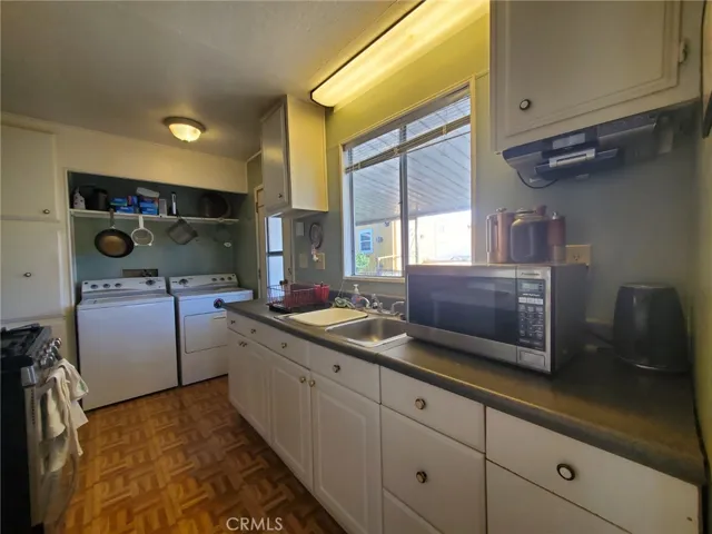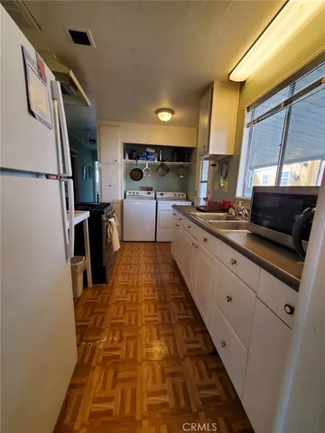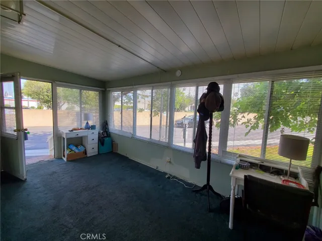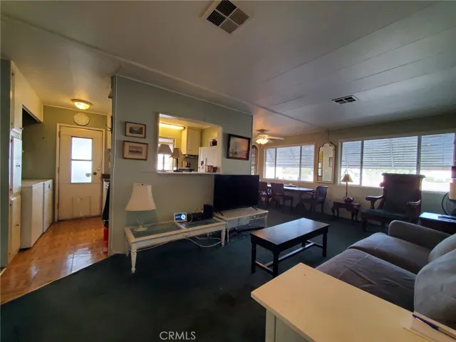 This charming 3 bedroom 2 bath home is located in a quiet 55+ park with only 1 neighbor! This home has been updated by the current owner and is ready for it’s next owner. Walking into the enclosed porch it has 2 rooms, its own swamp cooler and tons of windows which makes it the perfect place for an office and sitting room. The living room has carpeting, painted paneling and is open to the dining room. The dining room has a ceiling fan and a built in hutch with glass paneled doors. The kitchen features white cabinets, parquet flooring, a stove/range and refrigerator along with lots of storage. The washer and dryer are located at the end of the kitchen and are included with the home. The primary bedroom is in the back of the home and has carpeting, a large walk in closet and a private bathroom with a walk in shower, bidet toilet and new laminate flooring. The other bedroom features a mirrored closet and new laminate flooring. The main bathroom has new laminate flooring, a bathtub and large vanity with storage.