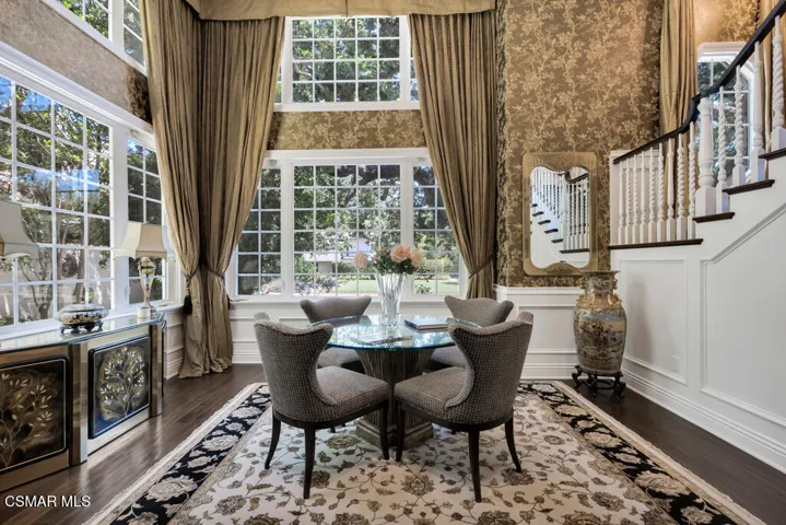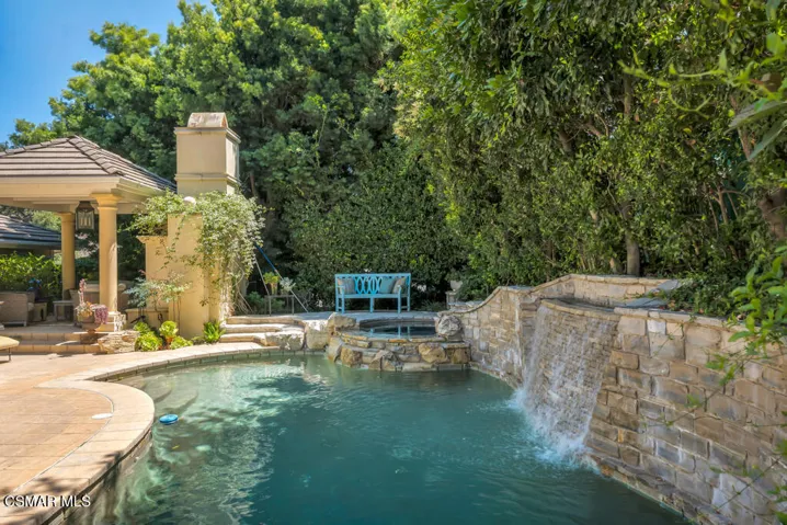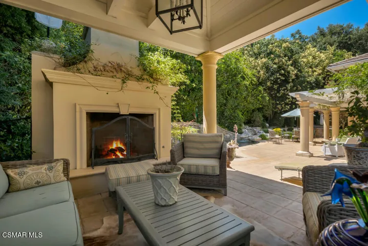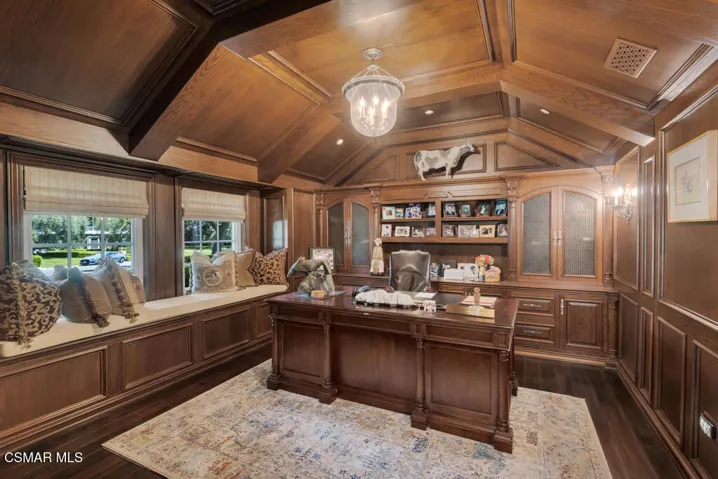 This is the ONE! EXCEPTIONAL QUALITY IN NORTH RANCH: If you value fine craftsmanship, timeless design, and attention to detail, this exquisite North Ranch estate is for you. No expense was spared in the construction and design of this traditional masterpiece executed with refined taste and top-tier materials throughout.A dramatic two-story foyer and custom-crafted staircase set the tone upon entry. Gorgeous walnut floors run throughout most of the home, complemented by designer carpeting and extensive use of classic white Carrara marble. The chef’s kitchen is a true showpiece, featuring rich wainscoting, intricate custom millwork, top-of-the-line gourmet appliances, a walk-in pantry, and French doors that open to the backyard.The flexible floor plan offers two inviting family rooms one of which could serve as a spacious bonus room. Throughout the home you’ll find stunning hand-hewn beams, floor-to-ceiling wainscoting, and bespoke cabinetry. An impressive oak-paneled office with detailed wall and ceiling treatments provides an ideal work-from-home setting.The luxurious primary suite offers a peaceful retreat, complete with a cozy fireplace, an elegant marble bathroom with a steam shower, and a fully customized walk-in closet. Upstairs are three additional bedrooms and two beautifully appointed bathrooms.Outside, the private, wooded yard is an entertainer’s dream, with a pebble-finish pool, spa, and cascading waterfall. A covered loggia with fireplace, a built-in BBQ island, and bar seating create the perfect outdoor living and dining spaces.Additional features include a 4-car tandem garage, plus fully payed for 34 panel solar system that reduces huge cost to almost nothing. All on an incredible lush tree lined lot with such a sense of privacy.A rare offering in the heart of prestigious North Ranch uncompromising in quality, and rich in character.