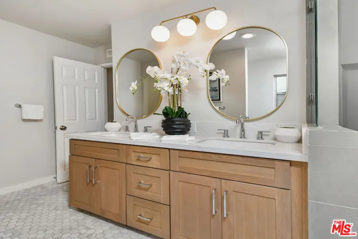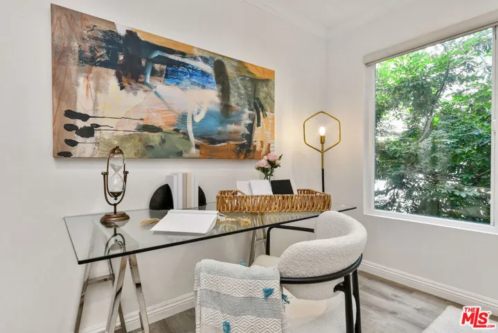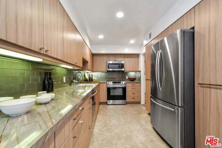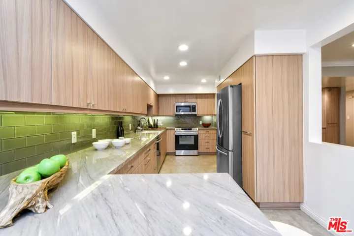 New Price! Absolutely turnkey and beautifully renovated, this single-level, front corner condo is the one you’ve been waiting for. With a smart, open-concept layout connecting the living room, dining area, and kitchen, it’s an entertainer’s dream. The inviting living room is anchored by a stylish fireplace, dry bar, and access to a private, east-facing patio; the perfect spot for morning coffee or quiet evenings. Enjoy peaceful views from every window. The cook’s kitchen provides stainless steel appliances, abundant warm tone cabinetry and extensive countertops allowing your culinary adventures come to life. Opposite the kitchen, you’ll find two spacious bedrooms and two full bathrooms. The primary suite features a walk-in closet and a newly updated bathroom with dual sinks and separate tub and shower. Both bedrooms offer large windows overlooking sun-dappled greenery bringing in gorgeous, filtered light throughout the day. Additional highlights include an in-unit laundry room, no shared walls, abundant storage, parking for two cars in a secure, gated garage and a controlled-access lobby. HOA earthquake insurance for 2025 has been prepaid by Seller. Located within the highly rated Beverly Hills School District and just moments from premier dining, shopping, La Cienega Park, Beverly Hills Tennis & Pickleball, Restaurant Row, LACMA, The Academy Museum and David Geffen Theater. A truly special home in an unbeatable location.