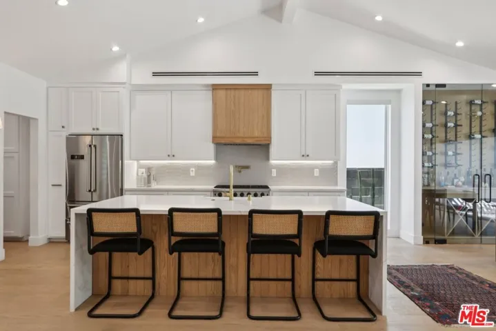 Welcome to this stunning, fully renovated Sherman Oaks residence, updated in 2022 with exceptional attention to detail. Beyond the private gates, you’re greeted by lush landscaping, a sleek tiled entry, and a striking wooden pivot door. Inside, soaring vaulted ceilings, wide-plank wood floors, and LED recessed lighting create a warm modern ambiance throughout. The chef’s kitchen features premium THOR appliances, white shaker cabinetry with brass hardware, a pot filler, and dramatic quartz countertops with natural veining. A massive center island with dual waterfall edges and a farmhouse sink opens to the dining area and custom glass-enclosed wine display. The open-concept living space centers around a chic herringbone fireplace and flows effortlessly to the backyard via bifold glass doors perfect for indoor-outdoor entertaining. Three beautifully designed bedrooms and three bathrooms offer spa-like comfort, with modern gray-and-white palettes, natural wood accents, black and brass fixtures, and LED vanity mirrors. The primary suite includes a generous walk-in closet and an oversized shower. Step outside to your private oasis featuring a covered patio, gorgeous landscaping, and a newly added mini jetted pool that can be heated to 140 degrees and cooled down to 40 degrees to simulate and ice bath ideal for relaxing and enjoying the California sun. Your spacious two-car garage has plenty of storage space and EV Chargers. Don’t miss this rare turnkey opportunity in one of Sherman Oaks’ most sought-after neighborhoods.