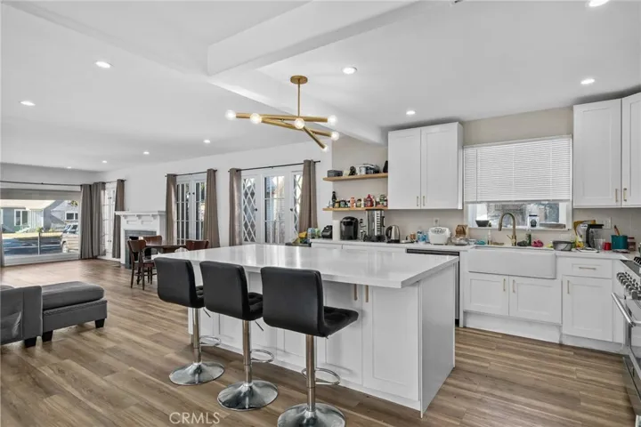 Step inside and experience the light-filled, open-concept floor plan featuring a modern chef’s kitchen. The kitchen shows off an oversized island, abundant storage, custom tile work, stainless steel appliances, and sleek shaker cabinets. The large living, dining, and sitting room combination creates a perfect flow for entertaining or relaxing, with a bonus space off the kitchen that’s ideal for a play area or cozy retreat with large windows.