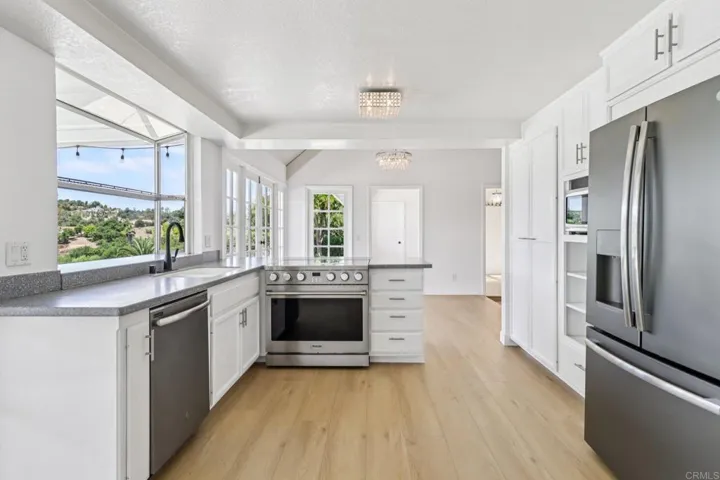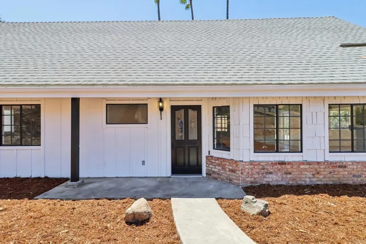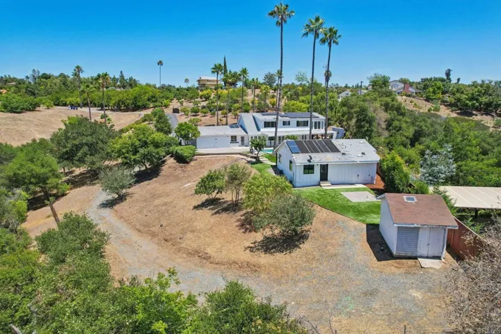 Experience extraordinary living in this beautifully reimagined Farm Style Contemporary residence, tucked away in the scenic hills of Fallbrook. If privacy, versatility, and wide-open space top your list, this nearly 4-acre property delivers—whether you’re dreaming of a hobby farm, space for large animals, room for storage, or simply a peaceful escape from the everyday. A gated entrance and fenced-in property welcomes you with mature palm trees, citrus groves, and a long driveway with ample parking. The main home (2,096sf) features 3 bedrooms, 2 bathrooms, and a spacious loft, all bathed in natural light and enhanced by soaring ceilings and brand-new luxury vinyl plank flooring. Along the back wall of the home, French doors in the kitchen, dining room, guest bedroom, and bathroom open to views of the pool—creating seamless indoor-outdoor flow. The kitchen is equipped with a new Thor 36” range and a 46-bottle wine cooler. Blending rustic charm with modern comfort, the open layout offers timeless character and an inviting atmosphere. Out back, a sparkling pool sits perfectly between the main house and a stunning detached ADU (permitted with a separate address). The 2-bedroom, 2-bath, 950sf guest home is ideal for multi-generational living, visitors, or rental income, and has been extensively renovated for stylish, turnkey comfort. Behind the ADU, you’ll find an additional storage shed and a fenced area for animals. The finished two-car garage has also been upgraded with overhead lighting, full drywall, paint, and custom wainscot detailing—creating a versatile space for gatherings, projects, or a workshop. Another detached storage shed has been converted into a cozy bonus space, complete with finished flooring, A/C, a mounted TV, and a sleeping area—ideal as a retreat, studio, or guest hideaway. With panoramic views and the tranquility of nature, this property offers an unmatched sense of peace and possibility. The home also features Fully Paid Solar, helping to warm the pool and offset the electric bill. The nearly 4-acre lot includes a variety of fruit trees such as grapefruit, lime, lemon, peach, orange, avocado, and pomegranate. A gravel road leads to a private gate that opens to a wide expanse of open land, perfect for walking, hiking, and exploring. Located at the end of a private street in Gird Valley near Monserate Winery, this home is a rare gem. Enjoy proximity to 8 golf courses and 10 different wineries, all within 25 minutes. Whether you’re envisioning your dream country estate, a family compound, or an income-generating investment, this home delivers style, space, and soul.