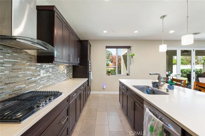 Popular floorplan located in the gated community of Roripaugh Ranch offering over 2,800 sq. ft. with 3 bedrooms + a flex space/office downstairs that can be used as a bedroom, 2.5 baths, and a spacious loft. The open-concept layout downstairs features a large kitchen, dining area, and great room—ideal for entertaining. A 16-foot bifold door expands the great room into the covered California Room, blending indoor/outdoor living. The kitchen is upgraded with shaker cabinetry, quartz counters, subway tile backsplash, and stainless steel appliances.