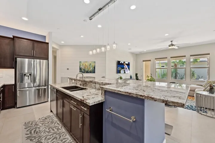 RARE OPPORTUNITY…Highly Customized & Meticulously Maintained Showstopper in CLOSE PROXIMITY to the CLUBHOUSE…Pristine SOLAR Powered Incantare Model (3BR/2.5BA + SmartSpace – 2,278 Sq. Ft. ) Featuring Attached 2-Room Casita & Exceptional Outdoor Living Area. Once you step into the formal entry you’re met with the stunning sense of QUALITY, CHARACTER, AND CHARM. The open great room layout with high ceilings, built-in speakers, sparkling light fixtures, rolling walls of glass and formal dining room is the ideal centerpiece for hosting and entertaining. Spacious kitchen features upgraded lighting, dramatic island with bar seating, stainless steel appliances and upgraded cabinetry. The primary suite features separate vanities, upgraded stone and tile appointments, customized built-in closet and passthrough access to laundry/SmartSpace. The guest bedroom and adjacent powder bath are located off the entry, while the 2-Room Casita with private entrance features cozy sitting room / den with wet-bar and en-suite bedroom with customized walk-in closet. Thoughtful SmartSpace with built-in cabinetry features two work stations with slab counters. Spacious covered patio with built-in speakers, paver decking, 3 retractable awnings, built-in BBQ with Allumawood Pergola and sparkling pool/spa offers ample outdoor entertaining. Customized and air conditioned garage features built-in cabinetry / work station, overhead storage, epoxy flooring, and whole house water purification system. Sonos sound system included. Don’t miss your opportunity to own one of Trilogy Polo’s Finest! Membership transfer available.