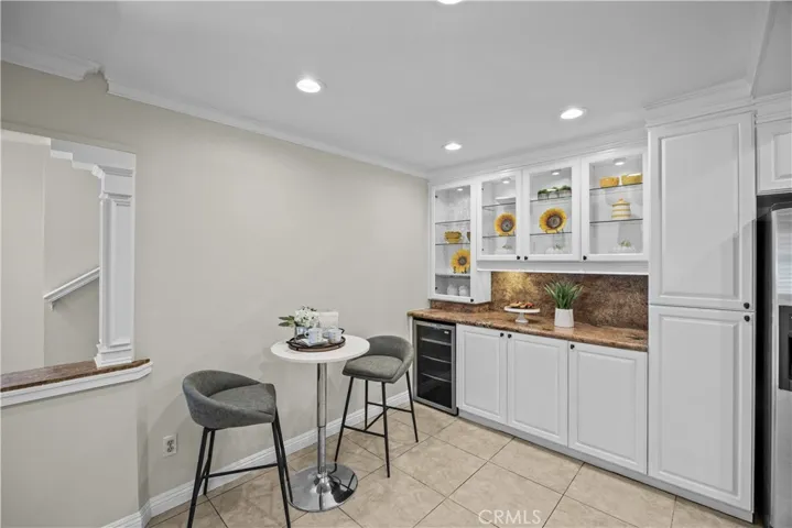 Step through the custom double-panel entry door into a warm and inviting space featuring a comfortable living room, open dining area, main-floor primary suite, and a remodeled kitchen with a breakfast bar and nook. The open-concept kitchen showcases granite countertops, glass-front cabinets, and stainless-steel appliances including a double oven, dishwasher, microwave, refrigerator, wine cooler, and water purifier.