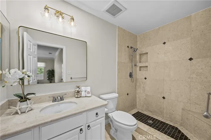 The main-level primary bathroom features new fixtures, while the upstairs suite boasts a travertine-surround shower, recessed lighting, and a new vanity mirror and lighting.
