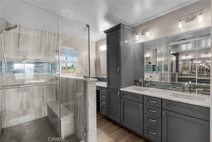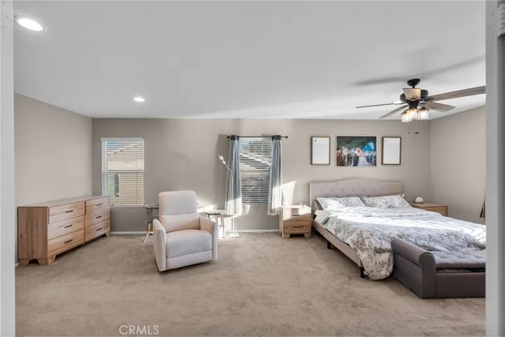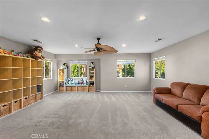 Upstairs, find two generous bedrooms, a full bath, laundry room, and a massive third bedroom that’s been converted to a children’s playroom. Additionally, the expansive primary suite dazzles with backyard vistas and a remodeled spa-like bathroom featuring tile backsplash, dual sinks, and makeup vanity.