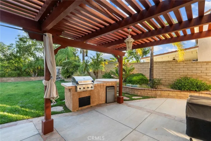 The crowning glory: a pool-sized backyard oasis featuring a covered patio ideal for outdoor dining, a tranquil waterfall, a built-in stone BBQ and panoramic views—perfect for family barbecues and starry nights.