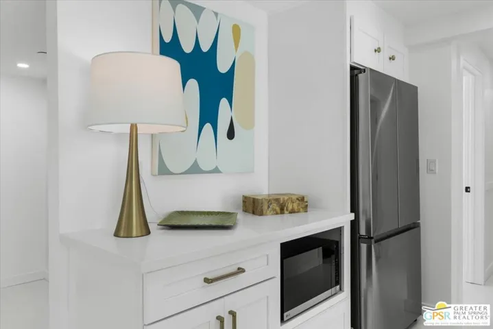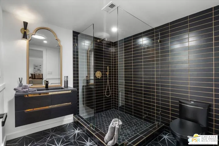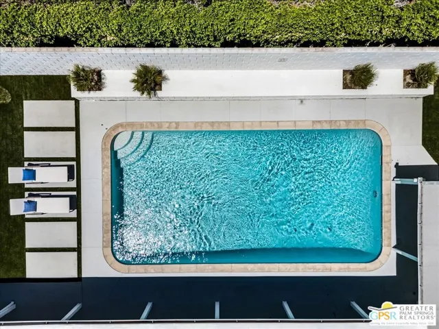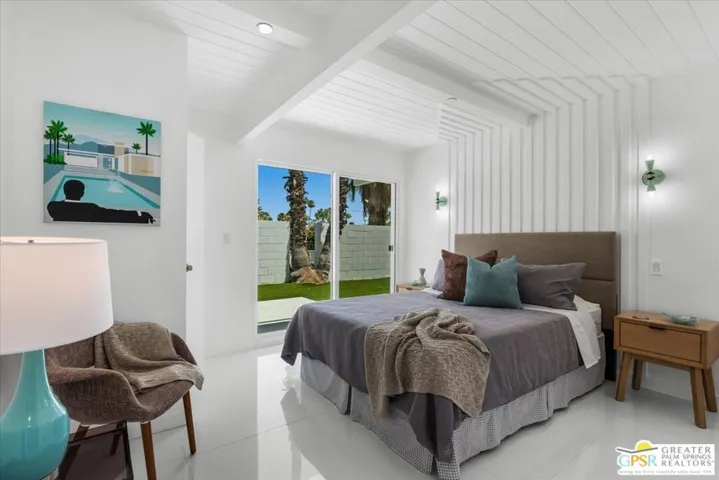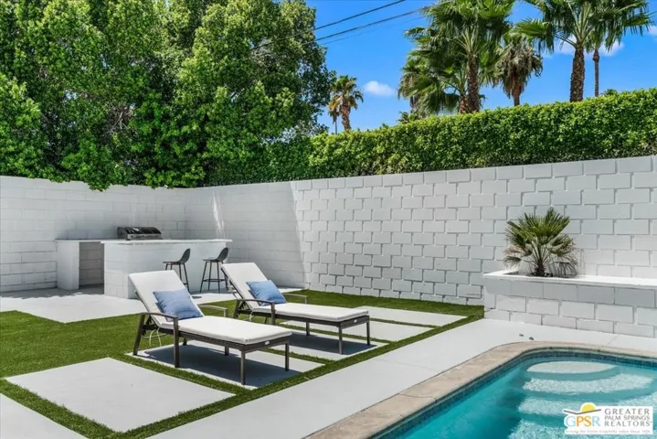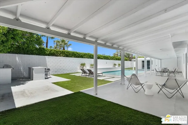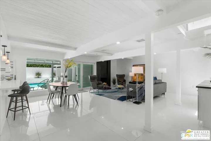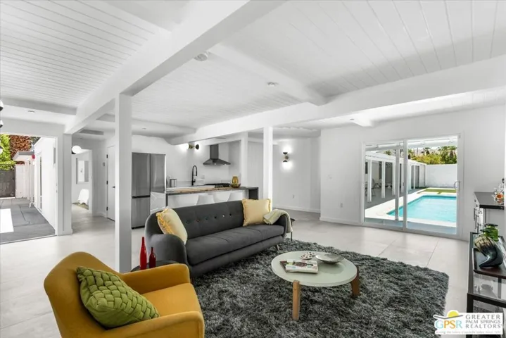 Located in the highly desirable neighborhood of Little Beverly Hills in South Palm Springs, this beautiful mid-century, Alexander-built home blends classic desert architecture with sophisticated modern updates. Completely redesigned, this home and casita feature five stylish bedrooms, four remodeled bathrooms, and contemporary tile flooring throughout the home and casita. The main house hosts four of the bedrooms, three bathrooms, an open concept kitchen with stainless steel appliances, and a living/dining area compete with a beautifully tiled fireplace. Blending the inside and outside living areas, a large glass sliding door and windows offer views from the living room and kitchen to the resort-style backyard complete with sparkling pool, built-in grill, and views of the San Jacinto Mountains. Accessed off the pool area or via a walkway on the north side of the property, the attached casita hosts the fifth bedroom, the fourth bathroom, a second open concept kitchen with stainless steel appliances, and a spacious living room with views to the pool and backyard living area. With an abundance of space and a flexible layout, this spacious home is ideal for entertaining, hosting guests, or perhaps creating a separate living area for an aging parent or relative. And Little Beverly Hills is currently under the 20% cap on short-term rental permits, so this home could possibly be used as an income generating short-term rental property. Other highlights of the property include dual pane windows throughout the home, 2 tankless hot water heaters, updated electrical, updated plumbing, updated sewer cleanouts, a gated driveway, and a whole house fire suppression system. With so many wonderful features and updates, this home is not to be missed. Schedule your private showing today!