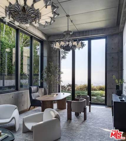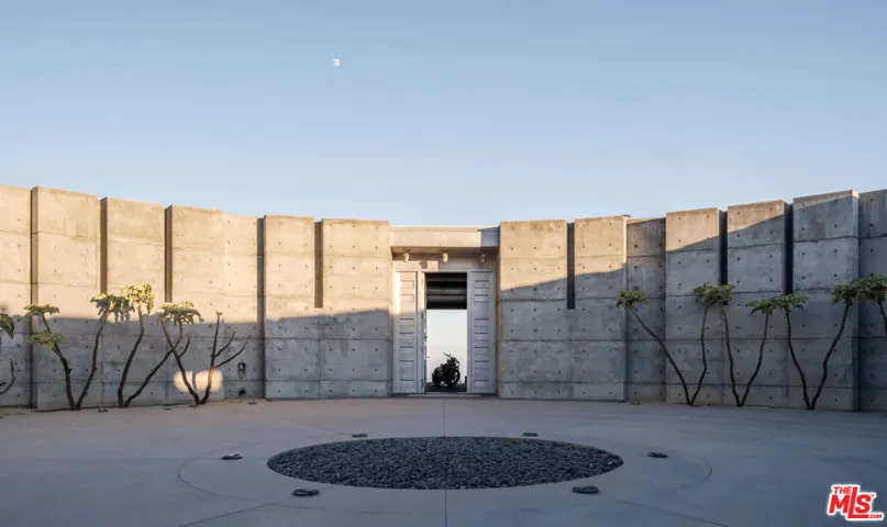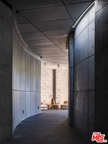 Set at the top of Trousdale, this unparalleled estate is a bold exploration of raw precision, industrial elegance, and sculptural architecture, all while capturing sweeping 180-degree southern views. Designed and built by the acclaimed ID Group, the home centers around a circular motor court enveloped by rhythmic board-formed concrete. Monolithic walls serve as both privacy buffers and dynamic light sculptures, casting dancing shadows from sunrise to dusk. Inside, the architectural intent continues with oversized concrete volumes, perforated metal ceilings, and brushed steel detailing. Framed views of the city and ocean command attention, most dramatically from the main living room, where a retractable glass wall opens to an infinity-edge pool and a horizon that stretches across the Los Angeles skyline. One of the home’s most striking features, a fully exposed concept motorcycle, is installed beneath a skylit entry, serving as a dramatic showpiece. Skylights and deep architectural reveals filter daylight through the interiors, creating a constantly shifting interplay of light and shadow. Resort-caliber amenities include a state-of-the-art theater, a spa-inspired primary bath, manicured grounds, walk-in humidor, and meticulously curated one-of-a-kind fixtures. Every element of the home, from its structural form to its bespoke finishes, has been purposefully designed, making 410 Trousdale a truly singular modernist retreat in the heart of Beverly Hills.