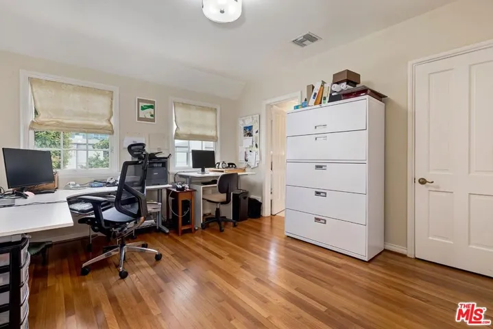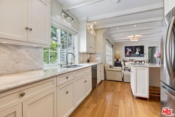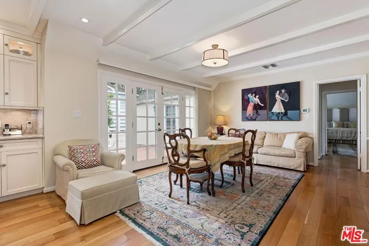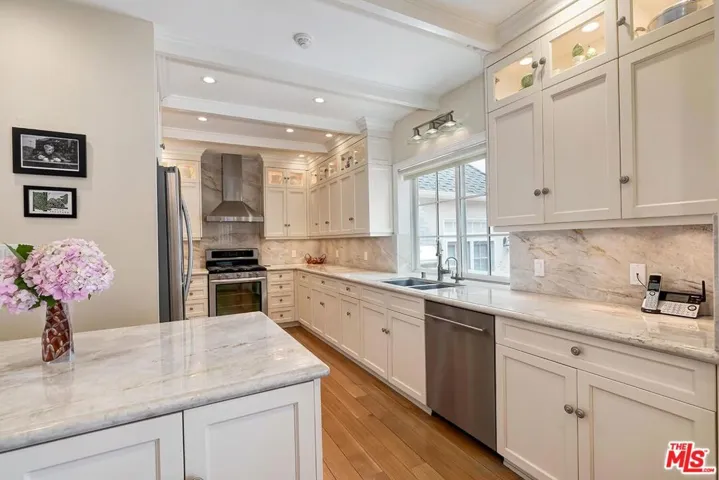 Set privately up from the street adding extra light and privacy, this exceptionally maintained Traditional home in the coveted Little Holmby neighborhood has been updated/renovated with taste and style offering a flexible floor plan perfect for a growing family or professionals needing multiple home office spaces. This single level house, with newer elevator access from the garage, retains all of it original detail work and charm featuring hardwood floors, crown moldings, chair railings, and numerous French doors throughout. The floorplan flows from a gracious entry to a grand step-down formal living room with a fireplace perfect for formal entertaining or intimate family gatherings, a remodeled gourmet kitchen with stainless appliances and stone counter tops beckoning to the aspiring chef, a convenient adjoining dining/family room area, and an expansive service/laundry room perfect for additional prep area for big gatherings or an extra storage space for big box store runs. The house boasts four separate bedrooms, all including en-suite baths, with two of the three family bedrooms presently configured as offices and an expanded primary suite, at the back of the house, featuring coved ceiling, multiple closets, concealed workstation and sumptuous marble accented bathroom with dual sinks, large shower and inviting soaking tub. In addition, the home has a lower-level work/storage basement plus a finished bonus room with full bath and separate exterior entrance. The house, centered on a raised lot, presents various outdoor spaces including glamorous brick patio accessible through French doors from the living, dining and one bedroom, a second private patio off the primary bedroom, and rear gardening area with raised planter beds. The home boasts updated systems, newer heat and air conditioning, exceptional interior and exterior storage and is EV ready with a level two Tesla charger. Beyond all its classic and modern features, the house is mere moments away from the relaxing atmosphere at Holmby park, the world-class shopping at Century City Westfield mall, the glamour of Beverly Hills, the cultural offerings of UCLA/Westwood and allows access to the prestigious, award-winning Warner Avenue grammar school.