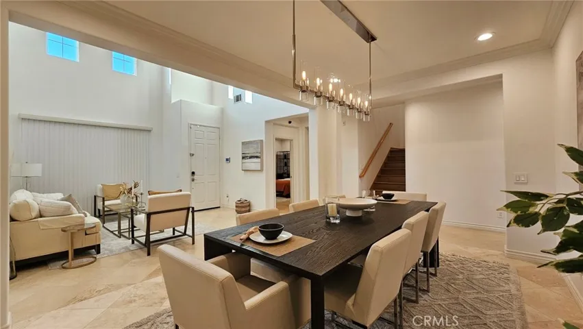 Step inside and be captivated by the grandeur of soaring ceilings, gleaming travertine floors, and custom crown molding throughout the main level. The expansive living area is perfect for entertaining, featuring a custom entertainment center, a cozy fireplace, and an abundance of natural light that fills the space. The gourmet kitchen is a chef’s dream, complete with premium stainless steel appliances, elegant quartz countertops, a stylish backsplash, and a convenient walk-in pantry.