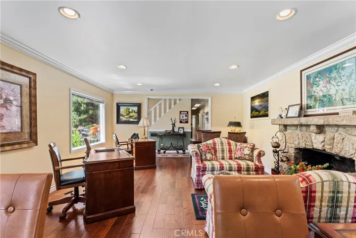 The main level features a welcoming entry, a separate client greeting room with a cozy fireplace, a spacious conference room (or executive office), two additional private offices, an updated kitchen with built-in cabinets, sink and refrigerator, and a beautifully remodeled full bathroom. A private enclosed stone patio offers a peaceful outdoor space — ideal for breaks, small meetings, or just enjoying the mountain air.