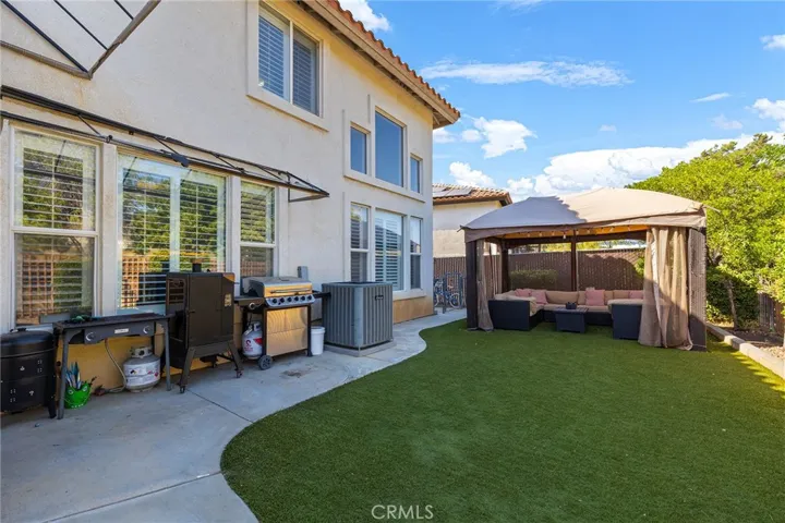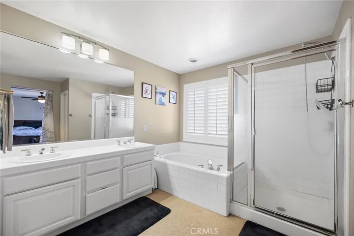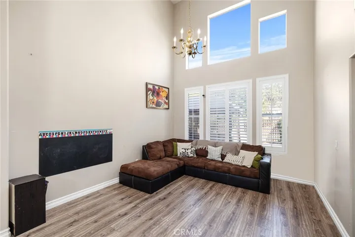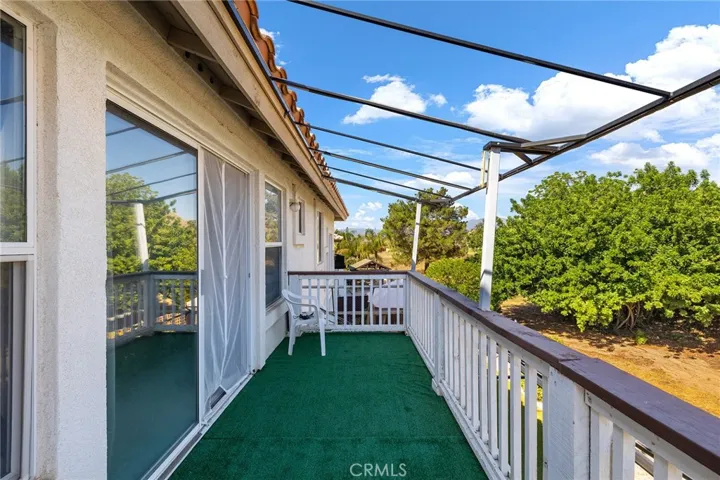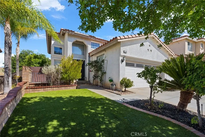 Low low tax and no HOA!! Welcome to the very best of both worlds in one of Eastern Moreno Valley’s most sought after neighborhoods, where you can maximize and enjoy peaceful living while being a few minutes away from shopping, entertainment, easy access to the 215 and 60 freeways! This RARE floor plan features 4 bedrooms, 3 full bathrooms! No expense has been spared in timeless custom upgrades! As you enter the home through the double doors, you will notice the cathedral ceilings, plantation shutters and neutral stunning laminate flooring throughout downstairs. The formal living room and dining room leads to the heart of the home where a chef’s kitchen features another dining area, modern granite counters with gorgeous island and bar height seating, appliances to include double ovens and stainless steel stove and microwave. The kitchen opens up to a large family room with cozy brick fireplace and adorned with windows for natural light. There is a downstairs bedroom with full bathroom perfect for overnight guests or live-in relatives. Upstairs features include an expansive primary bedroom suite with a balcony where you can enjoy breathtaking views and private bathroom with dual sinks, shower, soaking tub and walk-in closet. An additional two well proportioned bedrooms share a secondary upstairs bathroom with dual sinks. Enjoy the beauty of nature from your secluded back yard as the property backs up to golf course views providing privacy and a sense of tranquility with no rear neighbors. The drought resistant landscape adds an eco-friendly touch ensuring a low-maintenance and sustainable lifestyle. More features include whole house soft water system, separate laundry room with utility sink, an extended large driveway and a 3 car garage that offers plenty of room for your vehicles and storage needs. With proximity to parks, the Rancho del Sol Golf Club, Lake Perris Regional State Park and Moreno Valley College, this home offers both convenience and serenity. And with no HOA, it’s an opportunity not to be missed! This home is ideally situated near Kaiser Hospital, this location offers exceptional convenience for medical professionals and anyone seeking easy access to quality healthcare.This home combines comfort, style and practicality, making it a perfect choice for those seeking a well-maintained property.