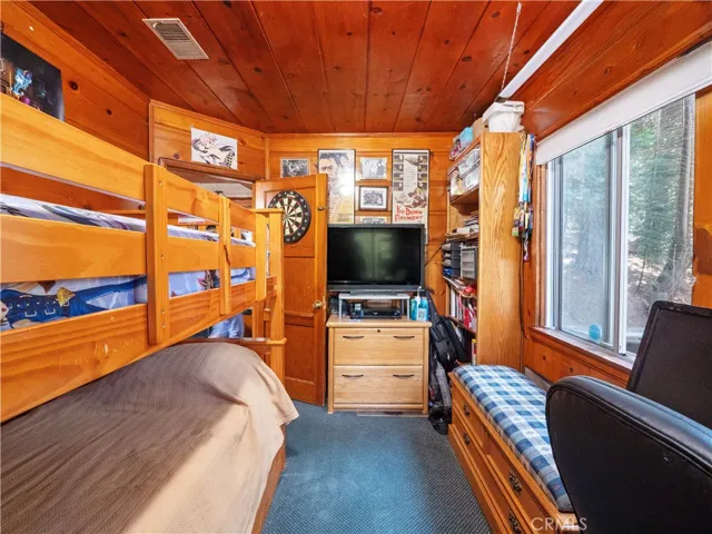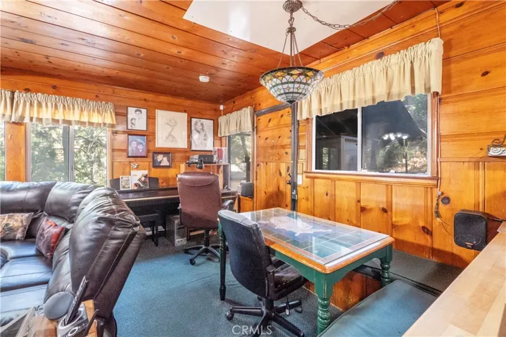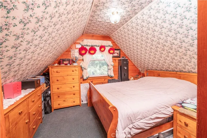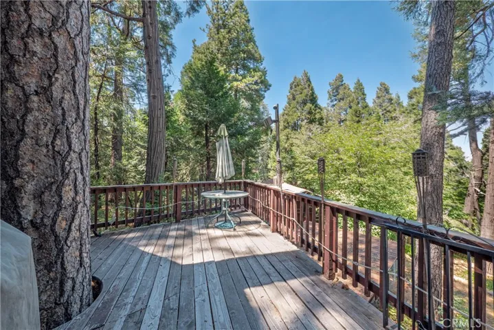 Nestled on a quiet street in Crestline Village, 23940 Cresta Drive is a beautifully updated two-level mountain cabin offering approximately 910 ft of living space on a serene 7,700sq of forested lot. Featuring 3 bedrooms and 1.2 baths, the interior is richly appointed with tongue-and-groove knotty-pine walls and vaulted ceilings, while a huge steel fireplace efficiently heats the entire home. Recent upgrades include a composition roof and a whole-house standby generator, ensuring durability and uninterrupted power, perfect for mountain living. Additional highlights include a two-car attached garage, a level backyard, and a redwood deck wrapping around a majestic mature tree. A detached, sound-proof studio or office equipped with electricity, gas heat, and AC provides a versatile workspace or creative use. Located less than a mile from Lake Gregory, the property offers convenient access to water recreation, hiking trails, and village amenities, all nestled within the natural beauty of the San Bernardino National Forest.