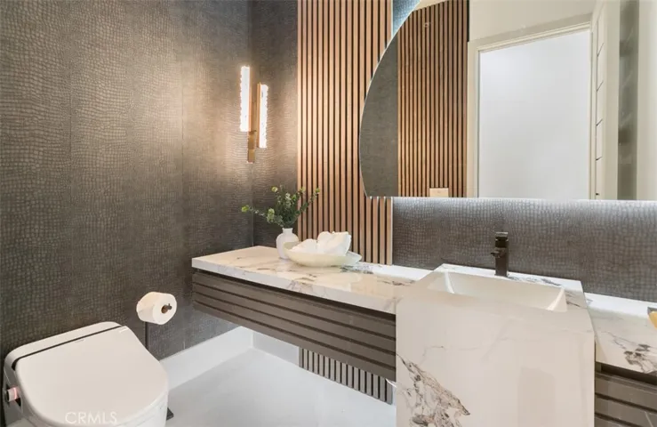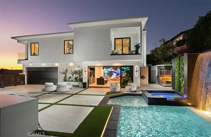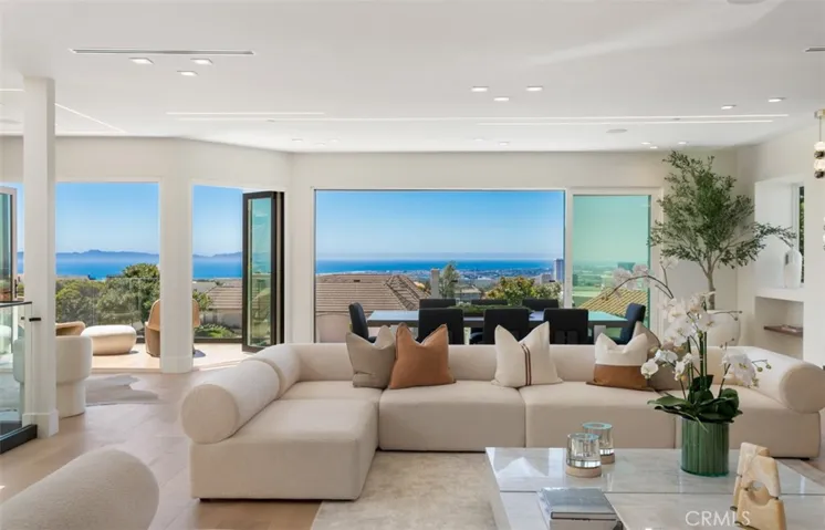 Perched at the end of a quiet cul-de-sac within the exclusive guard-gated enclave of Harbor Ridge, 4 Narbonne is a stunning showcase of design, function, and luxury. Completely reimagined, this architectural gem blends striking modern aesthetics with a warm, inviting ambiance—perfectly tailored for entertaining and everyday living. Beyond a private entry gate and custom oversized front door, you’re welcomed into a dramatic open-concept layout filled with natural light, curated finishes, and an effortless indoor-outdoor flow. The main level offers three spacious bedrooms, including a junior primary suite with ocean views, and two secondary bedrooms that overlook a serene water feature. A sleek lounge with a fireplace, bar, and media wall adds to the home’s entertainer appeal. Take the elevator upstairs, where panoramic views span the Pacific Ocean, Catalina Island, Newport Harbor, and city lights that stretch to downtown LA. Designed for both grandeur and comfort, this level features two additional bedrooms—one currently used as a home office with its own balcony—as well as a show-stopping primary suite wrapped in floor-to-ceiling glass. The spa-like bathroom and boutique-style closet complete the experience. The heart of the home includes both a front-facing designer kitchen and a full secondary prep kitchen, flanked by a breakfast nook, formal dining area, double fireplaces, and walls of sliding and bi-folding doors that dissolve the line between indoors and out. Step into your own private resort: a spectacular outdoor oasis with a pool, spa, dry sauna, multiple waterfalls, a BBQ island, fire table, and ample lounge and dining areas—designed to impress and built to entertain. With every box checked—guard-gated security, panoramic views, stunning finishes, and true turnkey luxury—this is coastal living at its finest.