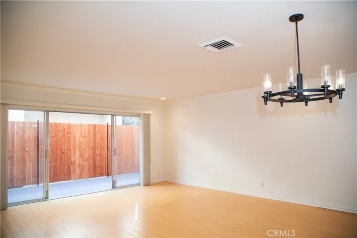 A two-story townhome features laminate flooring throughout, a fireplace in the living room, and a private large patio. The kitchen includes granite countertops and stainless-steel appliances: refrigerator, stove, microwave, and dishwasher. All-in-One Washer-Dryer is located inside the unit, in addition to a shared on-site laundry room. A privacy screen door at the main entrance for added airflow and security. Generous closet space and one designated carport parking space.
