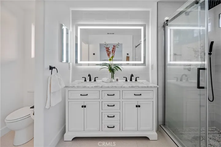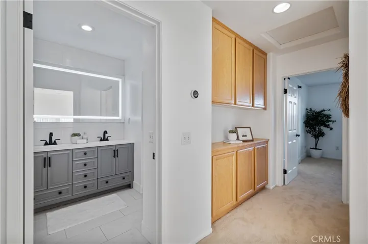 Upstairs, all three bedrooms are finished with carpeting. The remodeled primary suite boasts a hotel-like bath with a tiled shower, marble vanity with an LED mirror, and a custom walk-in closet with built-in drawers and shelves. Guest bathrooms include a full bath with a quartz vanity and LED mirror, while a powder room serves the main level.