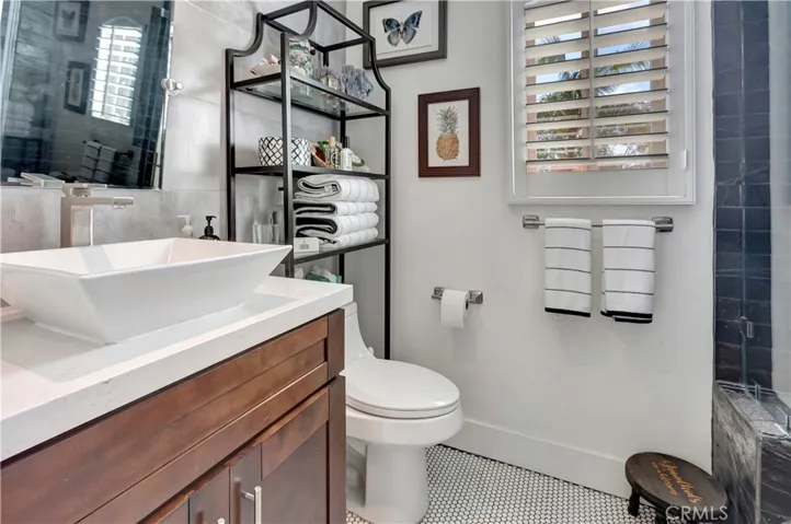 Upstairs, the spacious primary suite offers breathtaking golf course and water views, and a spa-inspired bath with black and white granite floors, quartz counters, vessel sinks, a freestanding soaking tub, and separate shower all followed by the entrance of the dual mirrored walk-in organized slider closets. The second upstairs bedroom features an en-suite bath with designer finishes including ebony stone, granite, and penny dot tile flooring. Additional highlights include 2 car finished direct access garage with built in cabinets and work bench, upstairs laundry, new custom windows, plantation shutters, newer HVAC system, and new roll up garage door to name a just a few.