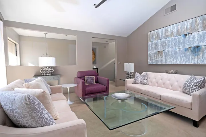A chic peid a terre in Palm Springs! This lovely turnkey designer furnished 2 bedroom / 2 bath home at Village Racquet Club!! With over 1600 square feet of living space, this townhome is located in central Palm Springs just blocks away from the city’s best restaurants and nightlife. The main level living room has a stacked-stone fireplace and vaulted ceilings that open to a private balcony. Enjoy the privacy of the quiet terrace level den, dining area, and intimate courtyard. The custom kitchen features stainless appliances and gas cooktop. The oversized primary suite has been extended, perfect for a home office or reading room, along with two walk-in closets. The home has a private, oversized one-car garage with laundry. Village Racquet Club has 8 pools and spas, tennis and racquet ball courts, gym, and a clubhouse all within a beautifully landscaped, gated community. Perfect for a 1 month+ vacation rental income property-or- year round home.