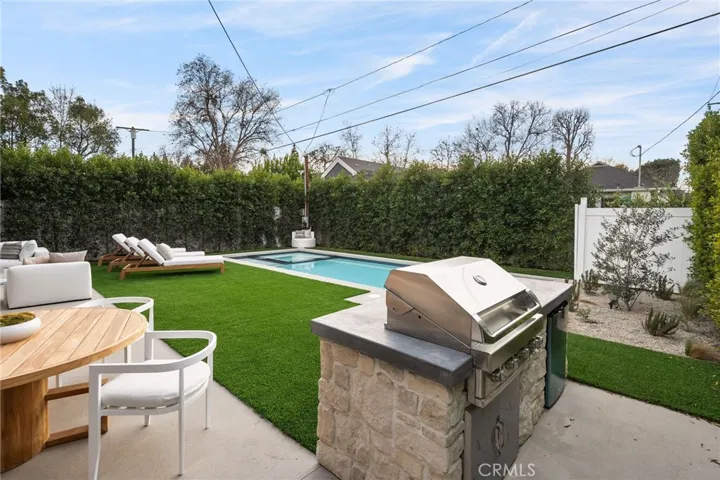 Situated on a gated corner lot in the heart of Studio City, just around the corner from Campbell Hall and Colfax Elementary, step inside this stunning brand-new construction to discover the pinnacle of modern day luxury living. This meticulously designed open floor plan is adorned with impeccable finishes and thoughtful details throughout. An oversized sliding glass door spans the full width of the home, seamlessly extending the family room and kitchen into the backyard for true indoor-outdoor living. Equipped with top-of-the-line Thermador appliances, a massive waterfall island and walk-in pantry, the gourmet chef’s kitchen is a culinary enthusiast’s dream. A butler’s pantry leads into the spacious formal dining and living room, the perfect space for hosting elegant dinner parties or intimate family gatherings. Upstairs, there are four generously sized ensuite bedrooms and a convenient laundry room. The chic primary suite consists of a private balcony, custom walk-in closet and sumptuous bathroom, complete with a soaking tub, large walk-in shower, double vanity and separate makeup vanity. Enclosed by privacy hedges, the entertainer’s backyard features a sparkling pool/spa, built-in BBQ, low maintenance artificial turf yard and ample patio space for al fresco dining and lounging. Additional highlights include high ceilings, a smart home system with integrated speakers, state-of-the-art security system and two-car garage. This home offers 4 bedrooms and an office/den with its own entry. Ideally located within the top-rated Colfax School District and just moments away from Ventura Boulevard’s vibrant shopping and dining scene.