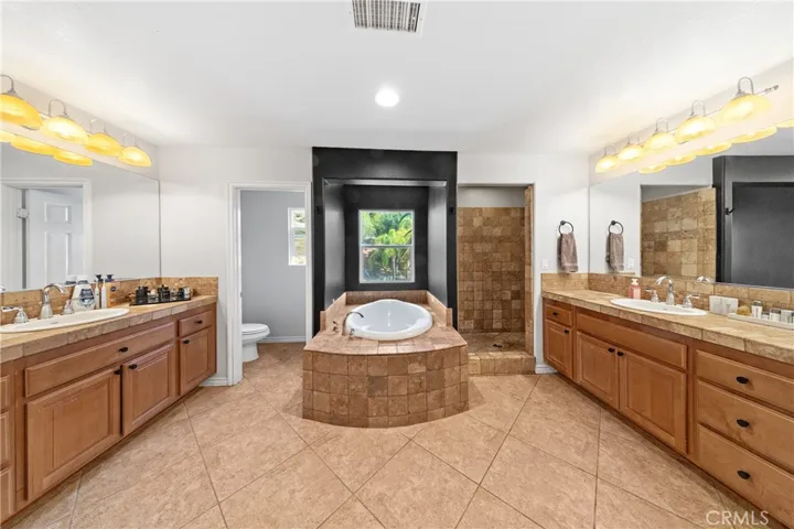 Primary suite: 2 walk-in closets (one organized), vanity area, travertine bath w/ separate shower & tub, dual vanities