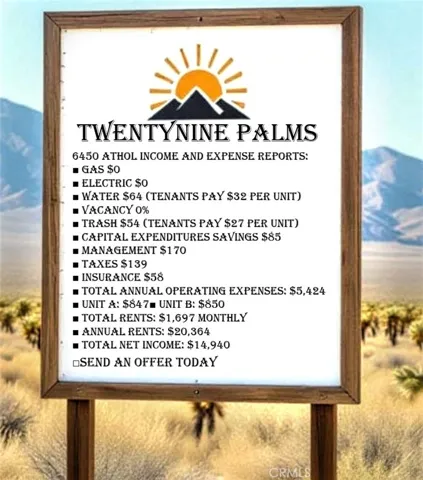 Priced to sell investment opportunity that awaits a savvy investor. Classic duplex with consistent occupancy located in 29 Palms. Great potential for the person that is looking for the right price and conditions on an income producing property. This duplex is a gem that has even more of an upside potential for future rents. Each unit consists of a one bedroom, one bathroom home that boasts great use of space and storage, wall unit AC’s and radiant wall heaters. Each one has it’s own water meter and gas meter as well as each having their own mailing address. Both units share a water meter. The front unit features beautiful exposed beam ceilings and the back unit has it’s own private back yard. Conveniently located next to schools and downtown 29 Palms which is really getting a lot of attention for recent improvements like some new chic restaurants, Freedom Plaza with it’s weekly farmers and art market and special events and concerts. The homes are also less than two miles from Luckie Park community park and community pool with baseball, football, skate park, basketball courts, playgrounds and more. They are less than five miles away from the main entrance to Joshua Tree National Park. Less than 6 miles from the 29 Palms Marine base. It is a great jump off point to all that the high desert has to offer. The seller willing to provide concessions for escrow closing costs. 2% credit for investor and 5% credit for owner-occupant at close of escrow. Live in one and rent out the other or rent out both. Come take a look and make this great property yours to own. Seller also has a second duplex for sale on Desert Queen in 29 Palms.