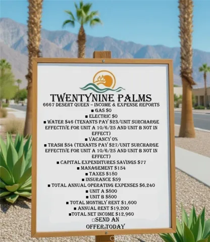 Priced to sell investment opportunity that awaits a savvy investor. Contemporary duplex with consistent occupancy located in 29 Palms. Great potential for the person that is looking for the right price and conditions on an income producing property. This duplex is a gem that has even more of an upside potential for future rents. Unit A consists of a two bedroom, one bathroom home that boasts great use of space and storage, swamp cooler and radiant wall heater. Unit B is a one bedroom, one bathroom home also with great storage, wall mounted AC units and a radiant wall heater. Each one has it’s own water meter and gas meter as well as each having their own mailing address. The units share a water meter. Both feature beautiful exposed beam ceilings. Conveniently located next to schools and downtown 29 Palms which is really getting a lot of attention for recent improvements like some new chic restaurants, Freedom Plaza with it’s weekly farmers and art market and special events and concerts. The homes are also less than two miles from Luckie Park community park and community pool with baseball, football, skate park, basketball courts, playgrounds and more. They are only five miles away from the main entrance to Joshua Tree National Park. Six miles from the 29 Palms Marine base. It is a great jump off point to all that the area and beyond has to offer. The seller willing to provide concessions for escrow closing costs. 2% credit for investor and 5% credit for owner-occupant at close of escrow. Live in one and rent out the other or rent out both. Come take a look and make this great property yours to own. Seller also has a second duplex for sale on Athol Ave. in 29 Palms.