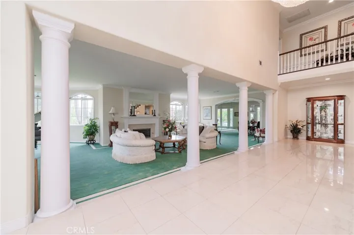A dramatic two-story grand entry with a crystal chandelier welcomes you. Wide double staircases leading to different sections of the upper level set an impressive tone upon arrival.