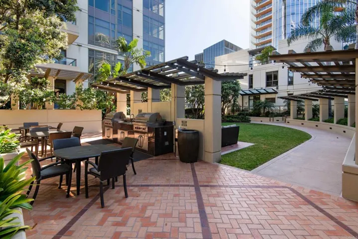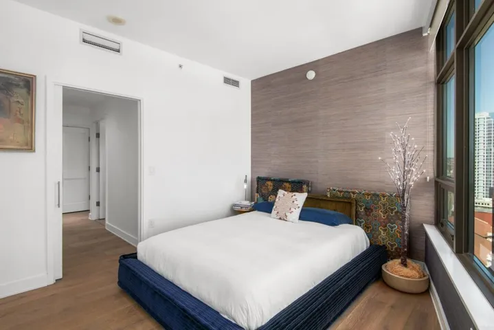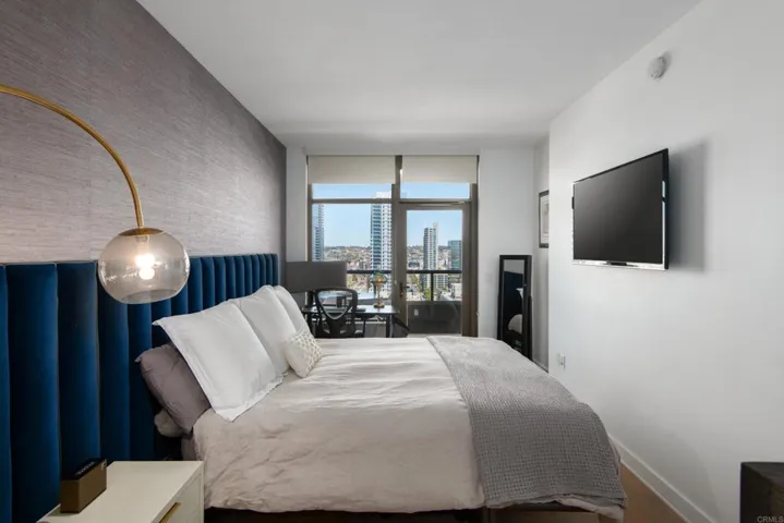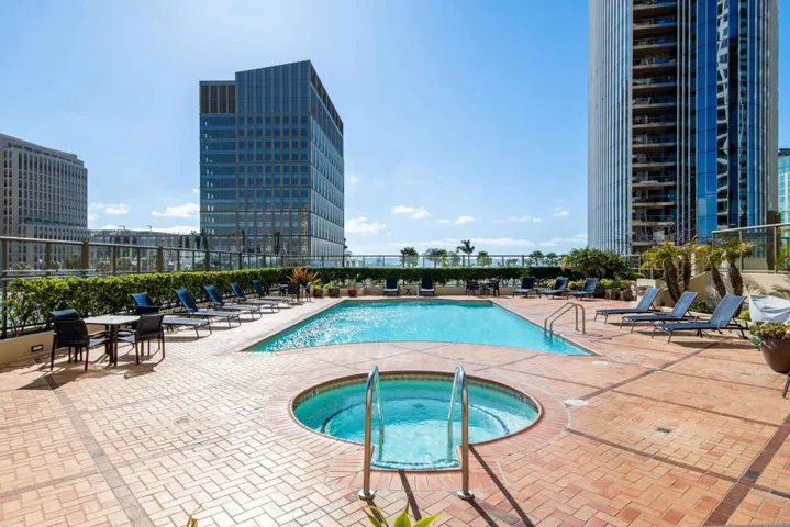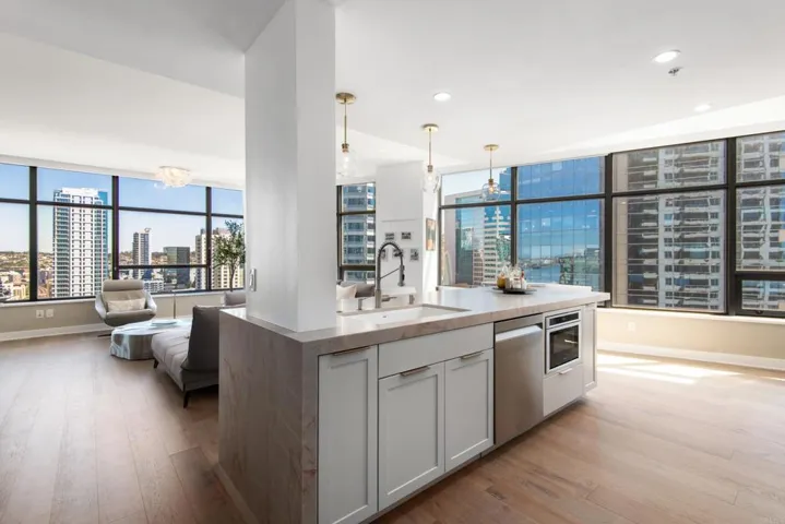 America’s Finest City has never looked better from this stunning 19th floor Electra with picturesque views from every direction. Contemporary sophistication awaits you in this highly desired (‘04 stack location) luxury condo featuring 2 bedrooms, 2 bathrooms & 1468 square feet of living space with elite ocean, San Diego Bay, Coronado & twinkling cityscape views. The equally impressive interior boasts a custom designed kitchen with natural stone countertops & waterfall edge, Bosch appliances, designer dimmable pendant lighting, high quality hardwood flooring, smart home features, 2 beautiful view balconies, full sized LG stacked washer/dryer, dual zoned HVAC & 2 parking spaces next to an electric charging station. Electras top-tier resident amenities include 24 hour concierge & top notch security. Luxuriate in the resort-style pool, spa, steam room, fitness center & romantic outdoor fireplace. A short walk to Waterfront Park, Seaport Village, historic train station, Little Italy, The Radys Shell, Petco Park & fabulous restaurants & shopping.