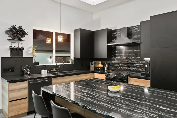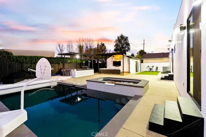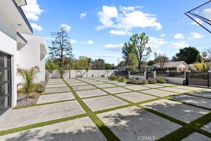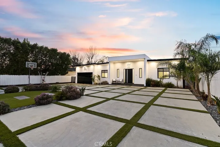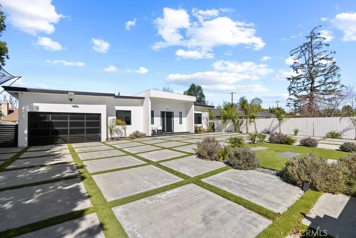 Welcome to this unique one-story modern masterpiece in the highly sought-after Walnut Acres Adjacent neighborhood of Woodland Hills. Fully rebuilt and reimagined, this expansive 3,300 sq. ft. estate offers 5 bedrooms and 4 bathrooms, including a detached guest house with 1 bedroom and 1 bathroom.From the moment you arrive, the electrical double-gated entry and circular driveway set the tone for privacy and elegance, providing parking for multiple vehicles, an RV, or even a boat. Step inside to a light-filled open floor plan with 14′ soaring ceilings, bespoke Wisconsin hardwood accent walls, custom built-ins blended with soft LED lighting, and a striking modern fireplace that together create a warm yet sophisticated atmosphere. The chef’s kitchen is designed for both beauty and function, complete with soft-close custom cabinetry, quartz countertops, a large island with breakfast bar, double sink, pot filler, high-end appliances, and plenty of workspace. The dining area, overlooking the backyard, creates the perfect setting for intimate dinners or lively gatherings. The primary suite is a serene retreat featuring vaulted ceilings, a massive walk-in closet, and a spa-inspired en-suite with dual faucets and a walk-in shower. Two spacious bedrooms share a modern Jack & Jill bath, while a junior suite offers its own walk-in closet & full bath. The detached guest house is a true bonus with its own fireplace, walk-in closet, and full bath, ideal for guests, a home office, gym, or rental income. Step outside to your private backyard paradise, a resort-style escape with a sparkling saltwater pool & spa, raised tanning deck, and covered patio with ceiling fan for year-round comfort. Host unforgettable gatherings with the outdoor kitchen, complete with double BBQ grill and built-in bar, then unwind by the sleek fire pit or dine al fresco in the covered lounge, all surrounded by lush, mature landscaping.