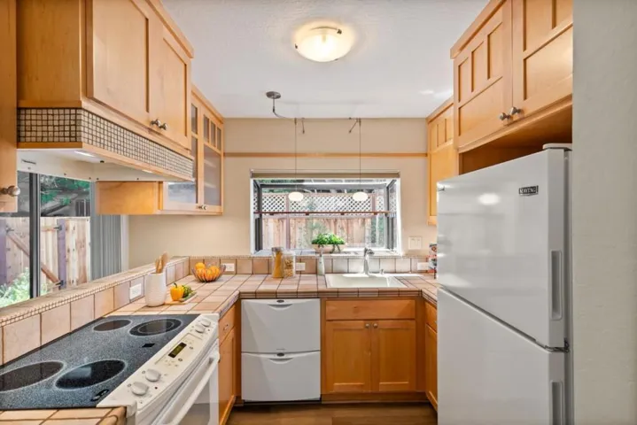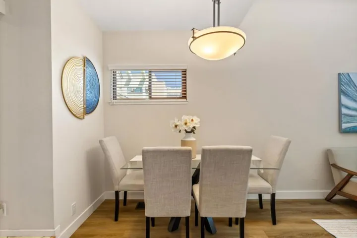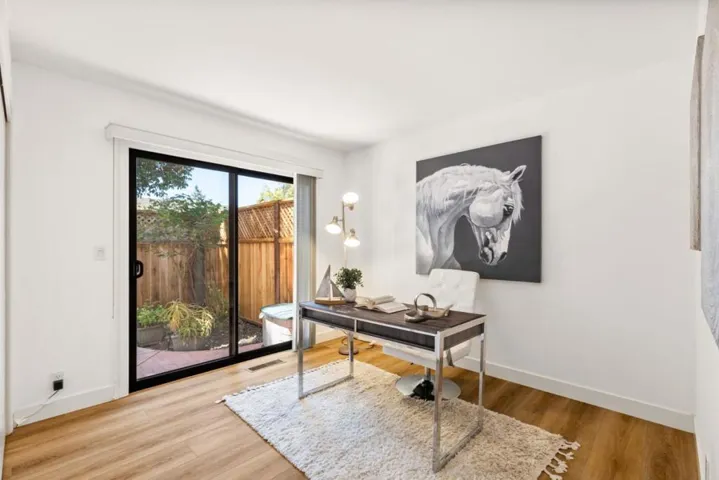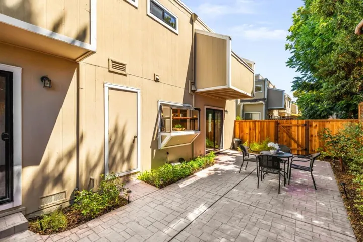 Price Improvement! Discover effortless living in this light-filled end-unit townhouse, featuring 3 bedrooms and 2.5 baths across two thoughtfully designed levels. The updated kitchen impresses with a garden window, sleek tile backsplash, Fisher Paykel dishdrawer, and durable laminate flooring that flows through the living and dining areas. Cozy up by the living-room fireplace, or step outside to your private backyard, enclosed by a newer fence. Upstairs, two ensuite bedrooms and a convenient laundry closet rest at the top of a carpeted stairwell; the primary suite delights with a vaulted ceiling, its own fireplace, and balcony overlooking the peaceful backyard. A semi-private balcony above the 1-car garage offers a perfect morning retreat. Nestled within a boutique 12-unit enclave, enjoy easy freeway access and a swift commute to Silicon Valleys tech hubs. Make this end-unit gem your own!
