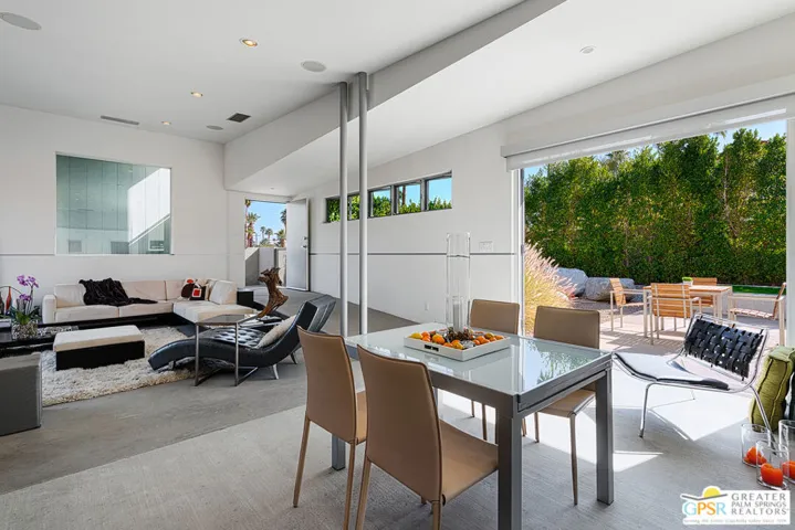 AVAILABLE March 16, 2026 to Dec 31, 2026, and starting April 1, 2027. Seasonal Rental. This unique Palm Springs modem compound is in the popular Twin Palms Estates neighborhood. The walled and gated property features multiple structures and outdoor spaces, resort-style amenities, and architectural design reminiscent of the iconic Alexander butterfly mid-century modern homes. This Palm Springs home truly speaks to the Art of Desert Living, has been cited and featured in a variety of magazines worldwide and won Home of The Year in Metropolitan Home. The art of desert living is best exemplified in a property’s outdoor amenities, and this property doesn’t disappoint. Amenities include a 60 ft saltwater pool, large saltwater spa, outdoor kitchen, outdoor bed, 4 fire-pits, 2 outdoor showers and more. There is about 2,000 sqft of interior space spread out over 3 buildings. The main house consists of a living room, dining room and kitchen. All rooms have concrete floors and large sliding glass doors, that when opened, blur the line between indoor and outdoor spaces. The living room features a wall mounted TV plus a large seating area with L-shaped sofa, ottoman and 2 comfortable chairs. A large sliding glass door connects the living room to an outdoor bed with pool and mountain view. Next to the Dining room is the kitchen. The two rooms are separated by a breakfast bar with a built-in fireplace. The kitchen itself has a modem and commercial vibe and features high quality appliances including large stove top with grill, oven, wine refrigerator, refrigerator freezer and dishwasher. The adjacent dining room seats six and has two over-sized sliding glass doors. One of the doors opens to a wood bridge that spans the pool to secondary ensuite bedroom and the other door opens to an outdoor dining room, distinctive firepit seating area and a detached structure solely for the primary bedroom and bathroom. The Primary Bedroom is a stand-alone structure just steps away from the main house. Like the main house it has concrete floors and a large sliding glass door, that when opened, blur the line between your bedroom and the outside. Inside you’ll find a King size bed, spacious closet, Smart TV and gas fireplace that separate the bedroom from the master bathroom. On the bathroom side, the fireplace is perfectly situated next to the large bathtub. Who needs candles when you can soak beside the flames of a roaring fireplace? There is also a large shower with waterfall shower head, two large sinks, a clerestory window and a door that opens to a private outdoor shower. The Guest bedroom/den structure features a guest bedroom with queen size bed and Smart TV. A bathroom connects it to the guest living room that features a couch that can sleep one, and another Smart TV. The main purpose of this Palm Springs modern compound is “rest, rejuvenation, and fun”. Flanking the 60 ft saltwater pool, lounge chairs and large outdoor bed float above the water while the outdoor kitchen with gas grill, refrigerator and bar seating area anchor to the additional yard amenities. Next to the outdoor kitchen is a bubbling saltwater spa which is just steps away from an additional outdoor bed perfect for lounging. At the other end of the pool is the Pool House that provides an outdoor shower, cabana room and washer/dryer. On the other side of the compound is a distinctive seating area where guests can sit or lie on huge boulders encircling a recessed fire pit that shoots flames right out of the ground. This desert modern home is distinctive and award-winning; providing an elemental experience that includes earth, fire and water with a generous serving of Palm Springs architecture, upscale amenities and conveniences, and a chic urban vibe.