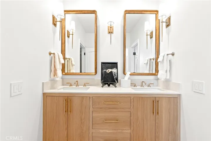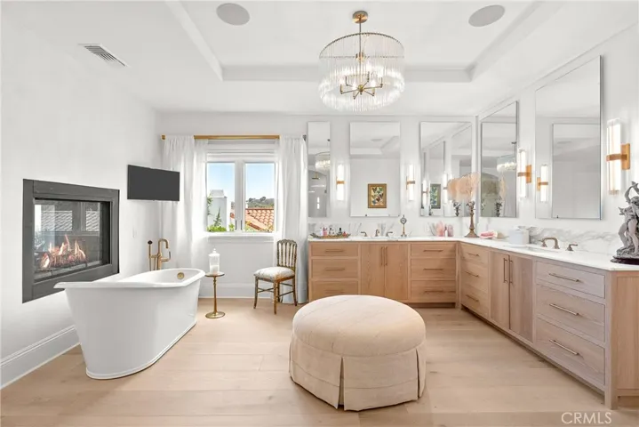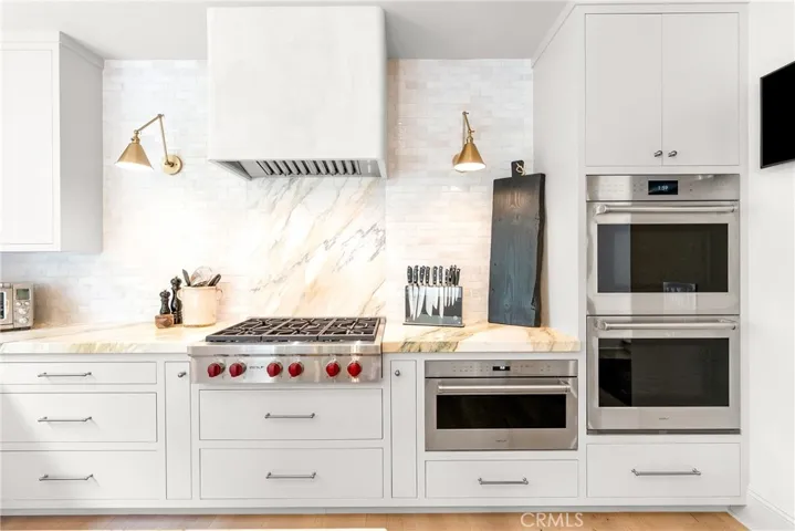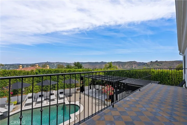 Welcome home to this stylish and elegant home in the guard-gated community of The Ridge in the heart of Calabasas. Situated near the end of a cul-de-sac, this extensively renovated home has been updated to the highest standards – with no expense spared – and is perfectly designed to enjoy indoor-outdoor living at its best. As you enter the two-story foyer, you’ll notice the gorgeous large slab limestone floors, an abundance of natural light, and beautifully appointed formal living and dining rooms on either side. Just beyond, the spacious family room with fireplace looks out over the entertainer’s backyard and flows into the show-stopping chef’s kitchen, featuring striking Calcutta Borghini marble counters and center island, Wolf appliances, custom solid flat sawn white oak cabinetry, and Zellige tiles. The lower level also includes an office overlooking the backyard, a bedroom with en-suite bath, and a fabulous powder room with a backlit onyx sink. The beautiful limestone extends upstairs, with 10″ wide European white oak wood flooring covering the remainder of the residence. Once upstairs, you find a generous loft/family room and a balcony with sweeping views. The private primary suite boasts stunning views, a two-sided fireplace, and a luxurious spa-like bath with a soaking tub, large walk-in shower, and dual custom closets – all crafted with timeless, high-end materials. The refined details extend to the secondary bathrooms, where you’ll also find solid white oak cabinets, hand-made and cut terra cotta and marble flooring, Zellige tiles, and premium fixtures. The backyard oasis features a pool and spa framed by beautiful hedges and includes a fire-pit, a bbq area with a pizza oven, a cozy dining area, and lush, sophisticated landscaping – perfect for both relaxing and entertaining. Finally, this home is outfitted with a tankless water heater, premium audio, and a comprehensive video security system.