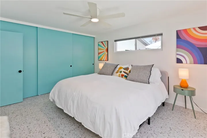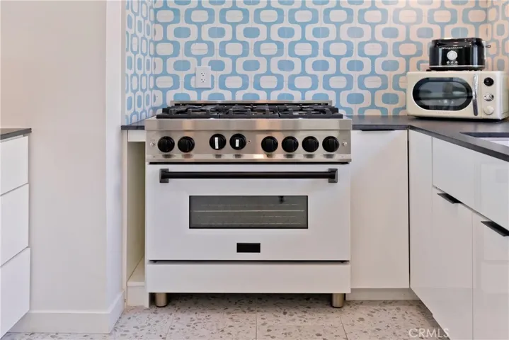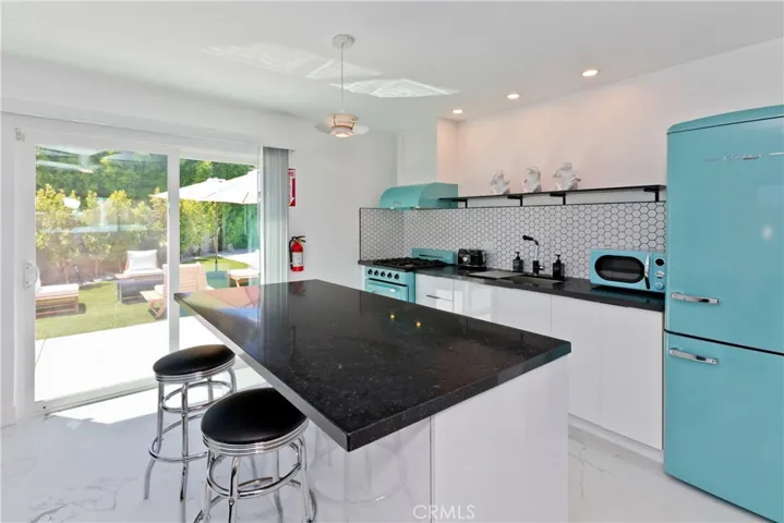 Inside the main home, it’s cool, clean, and completely curated for style and comfort. Underfoot, sleek terrazzo tile gleams beneath a flood of natural light. The all-new gourmet kitchen is a chef’s dream, featuring soft-close cabinetry, charcoal-hued granite countertops, a 36″ professional gas range, an under-counter ice maker, and a retro-inspired passthrough window that swings open to the outdoor bar — perfect for cocktail hour under the desert sky.