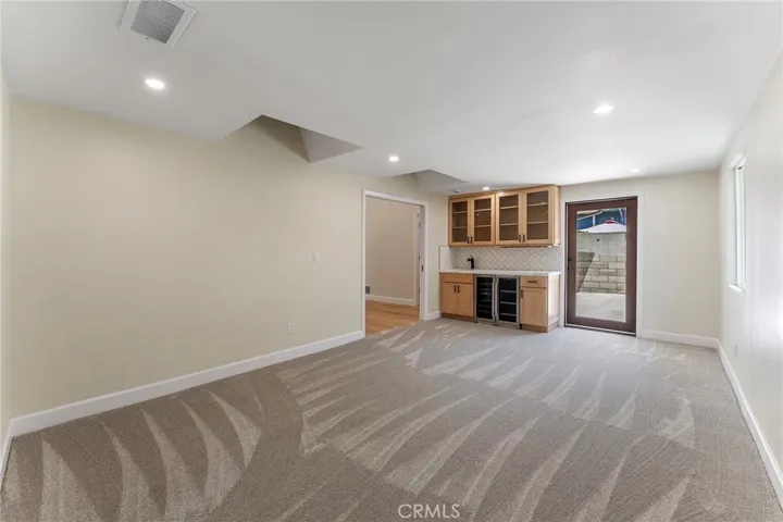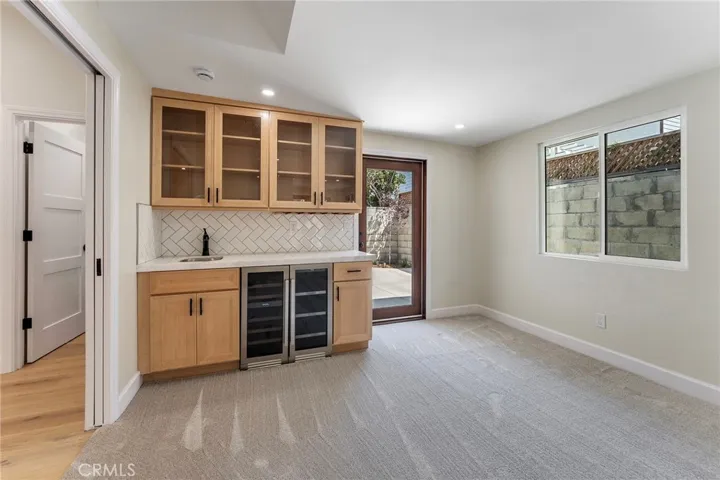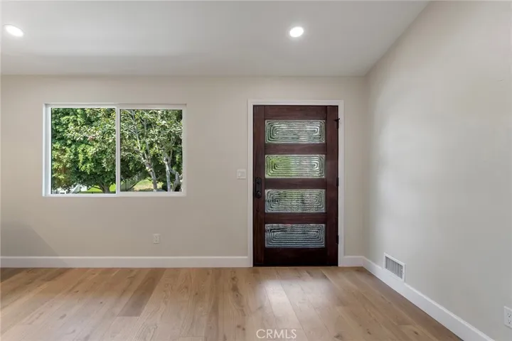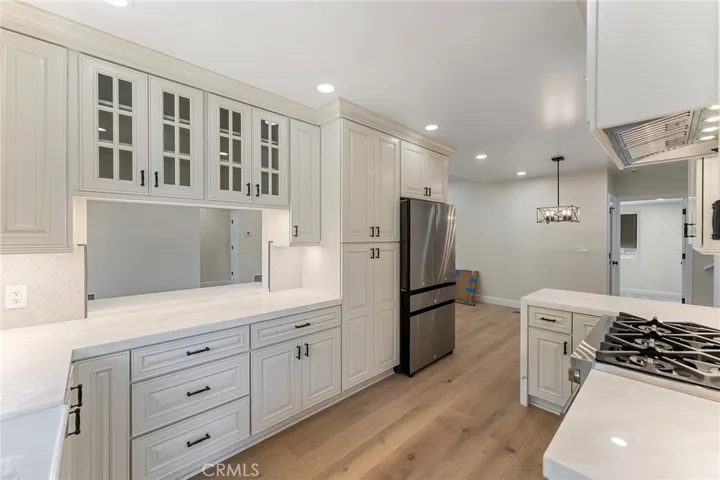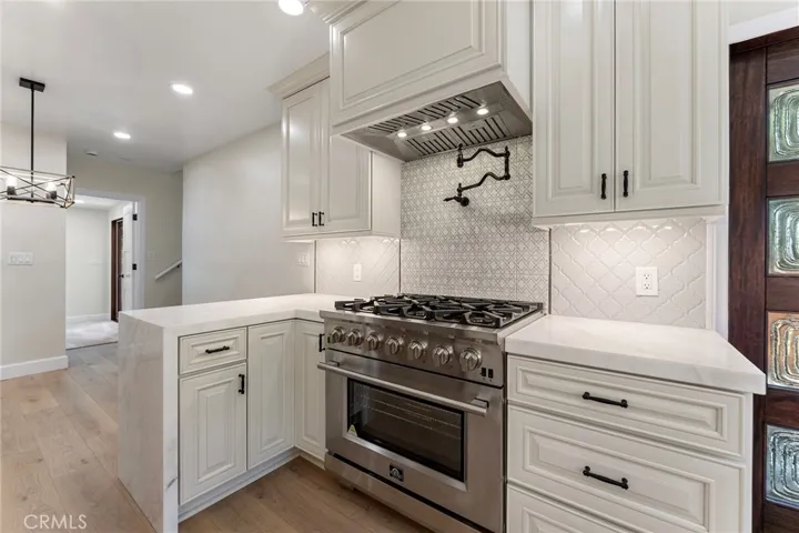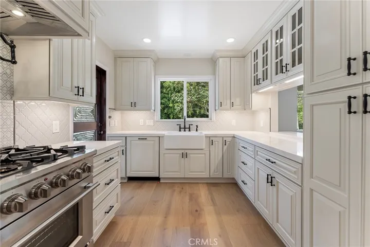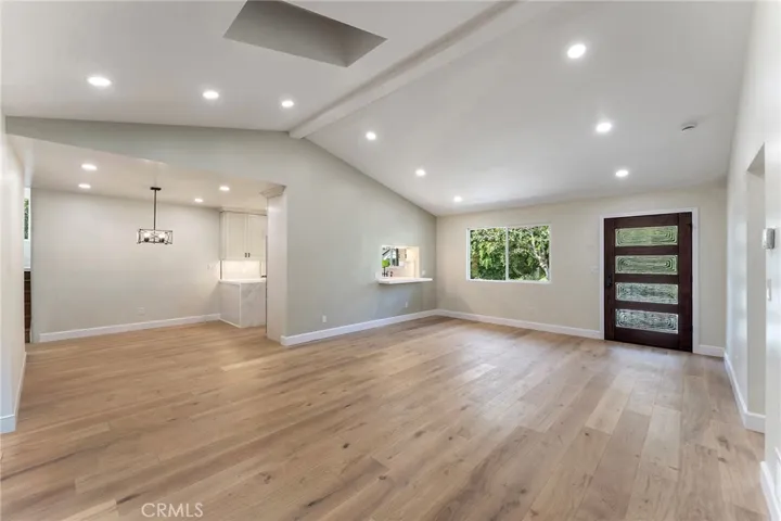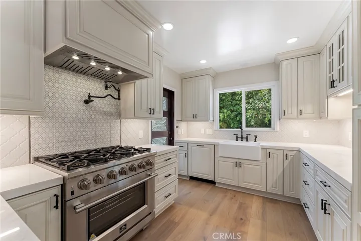 This extensively renovated Larchmont residence blends modern elegance with timeless charm, offering a lifestyle that’s uniquely Los Angeles. Behind the new mahogany front door, a light-filled living room welcomes you with soaring vaulted ceilings, recessed LED lighting, and white oak hardwood floors. The open flow leads seamlessly into a custom chef’s kitchen, featuring a stainless Forno Capriasca 36″ 6-burner range, custom range hood, quartz waterfall countertops, LED cabinet lighting, farmhouse sink, Bosch panel-ready dishwasher, stainless counter-depth French 4-door refrigerator, decorative tile backsplash, all-new cabinetry with crown molding, and a walk-in pantry.